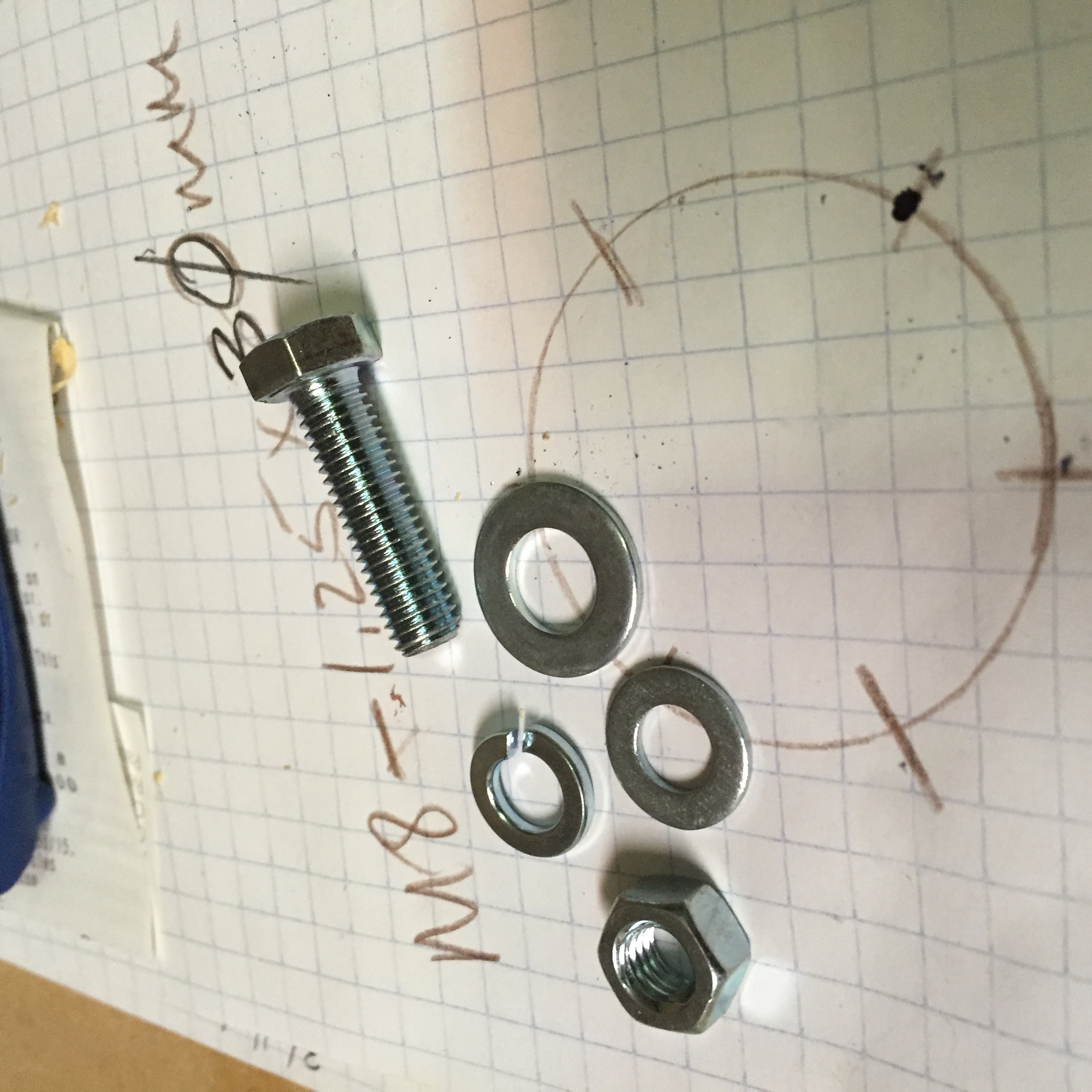 M8-1.25x30mm bolts and M8 hex nuts and M8 split washers and M8 and M10 flat washers: