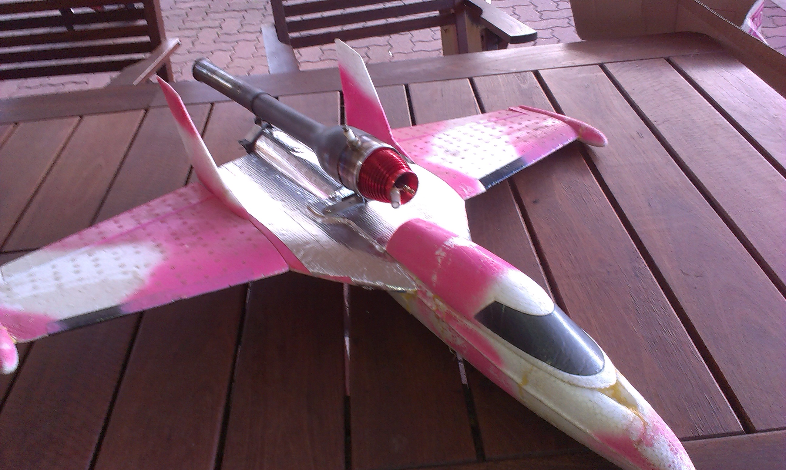 Here's a pic of mine. Its a multiplex funjet. Originally a pusher prop hotrod. Has a IV bag for a fuel tank to eliminate the need for a fuel pump. Hilarious.