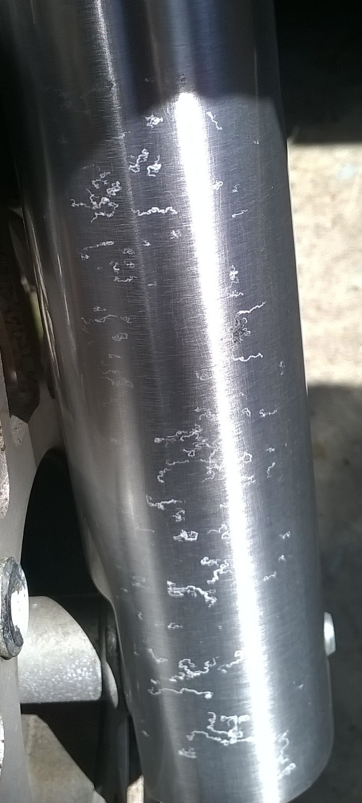 Anyone have any tips on getting rid of this ?? This seems to have appeared almost "overnight". It's only on the leading face of the forks, not around the sides or rear, chalky yet resistant. Tried Mothers Mag and Aluminum polish...no result.