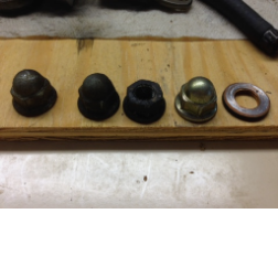 Well guys thanks for your input thus far. I am still waiting on my honing tool and the piston which should arrive tomorrow. In the meantime I am laying out the nuts and bolts in order to reassemble the cylinder and the head. I am pretty sure that I have it sorted with the exception of the 4 nuts that hold the head down. The previous owner did a pretty good job of bagging up the parts but I cannot find a set of matching 9mm nuts and washers. Unfortunately my manual does not show a clear picture of the nuts and as I didn't take it apart I am not sure what they look like. Also the manual says to use a copper washer on the stud nearest the exhaust port but there is no reference to washers on the other studs. So here is the question, are the nuts on the studs domed like in this image and is there an odd one as shown here.
