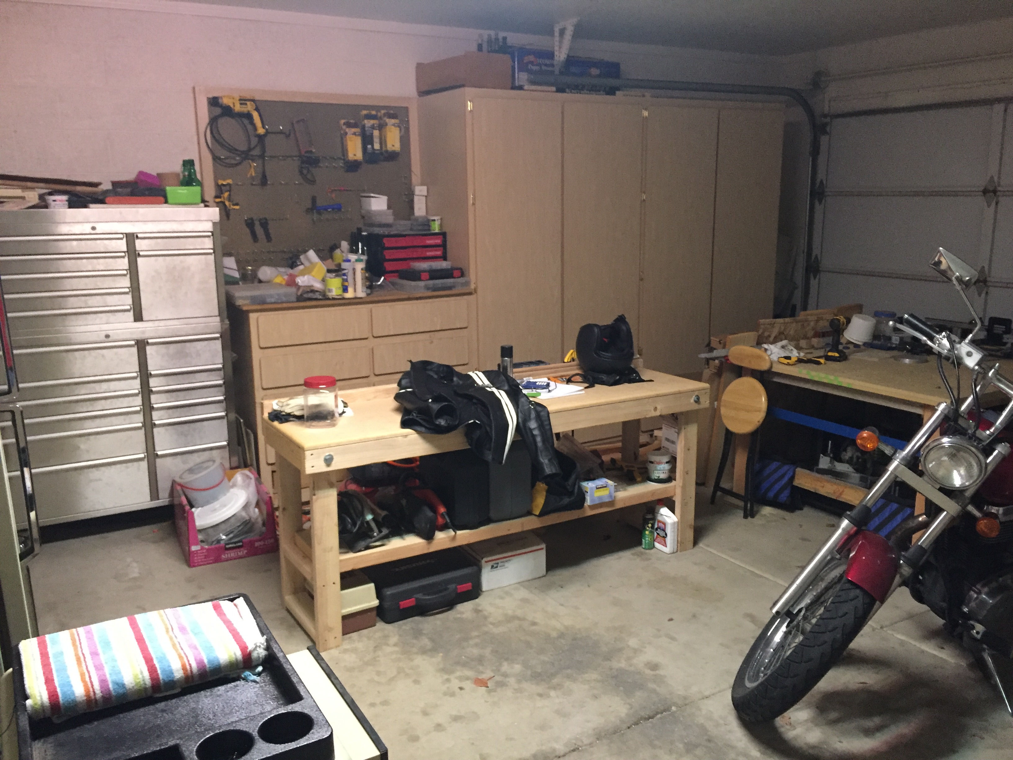 Tools, workbench, vise, drillpress, refrigerator, shelves, for oil, filters, battery charger, anti freeze, various lubricants,,and, a board on top of the fridge, coffeemaker, cups, coffee,