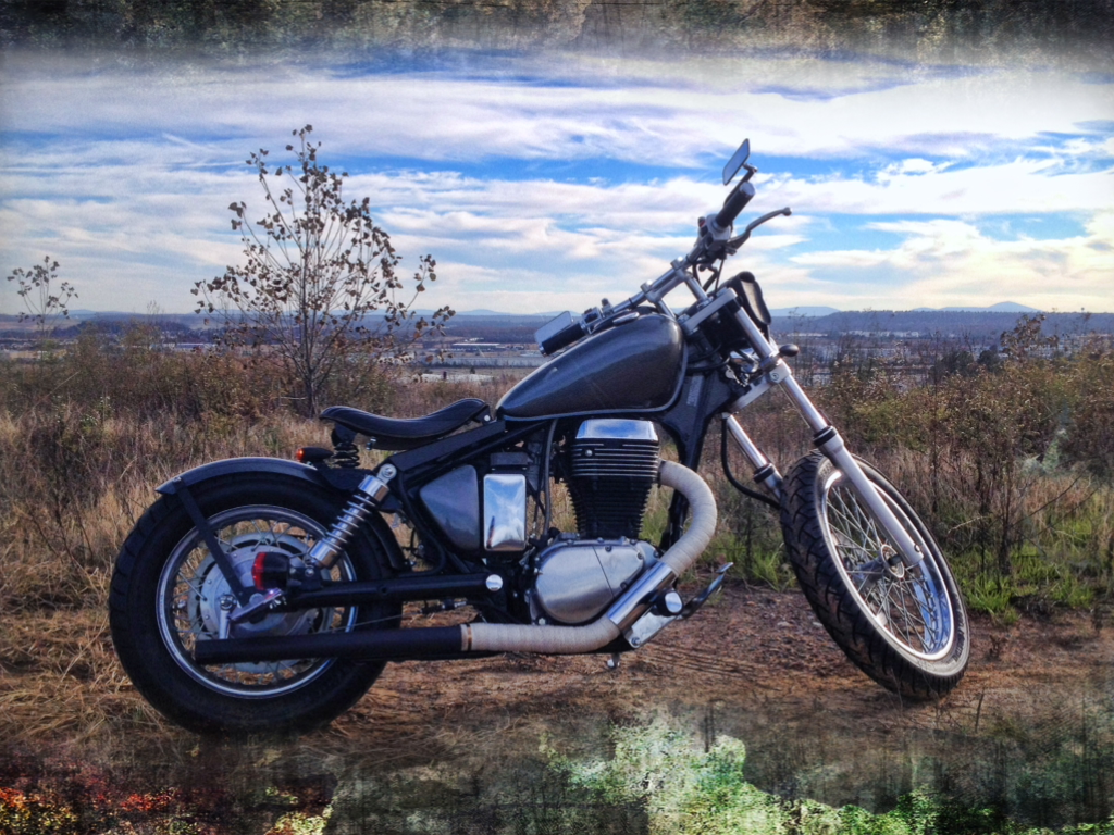 '05 S40, dyna muffler, rejet, high flow filter, Mobil 1 Racing 4T, Shinko 230 set with 140/90 rear, raptor, seat lift, LED running lights/signals, tach, reversed risers, homemade MR10 Lexan windscreen