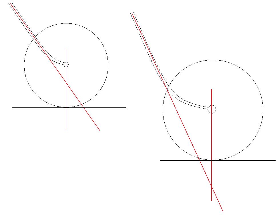 look at the pic on the first page. By moving the wheel center forward with a curved fork, you're decreasing the trail. The imaginary line drawn through the steering axis doesn't change.