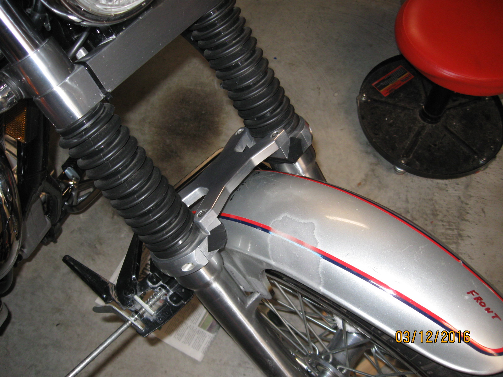 The ears to mount the Kawasaki fender are somewhat wider than the S40 ears. Can a sheet metal guy make the 2 bends on each ear to be easily able to slide it into position? You can see I have a clamp squeezing the fender together to be able to slide the fender between the fork legs. I don't want to risk scratching the fender after I get it powder coated? I know my hands are not strong enough to squeeze the fender between the forks and get the bolts started.