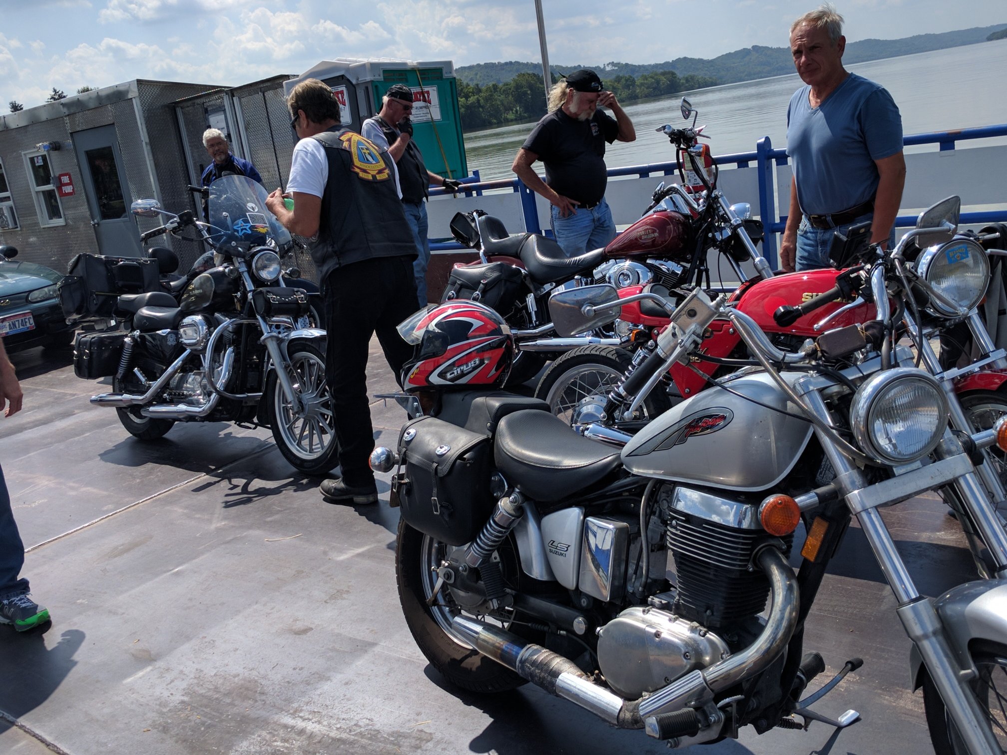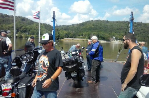 We went from the Pizza place to give our bikes a boat ride across to Ohio river and instead of waiting for the ferry-boat to get there --- we just drove right on and the boat took off !   I'd never give my bike a boat ride before (I think it liked it )  Grin .   There were two Older Harley Fellers on there with us too.  There was a feller on the ferry (in a car) that wanted a bike so bad he was drooling !  .   Well, when we all cranked-up to leave he didn't stop drooling and get back in his car till we were circling the parking lot to regroup ,  I could under why -- the whole day was going just perfect !  Smiley