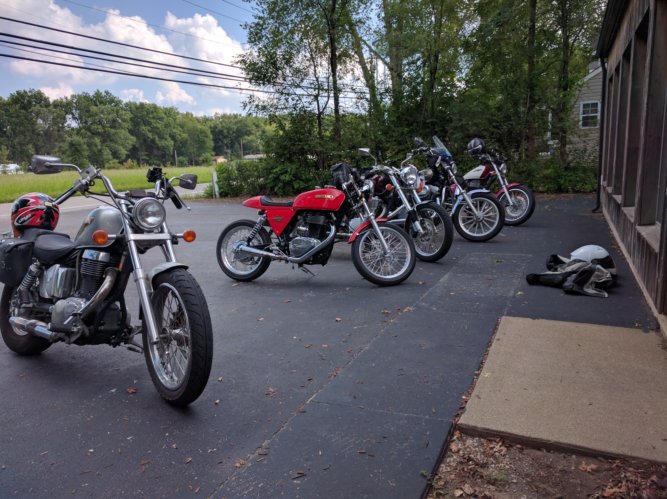 In the morning hours we all washed the bikes, as we had gotten rained on the previous night while headed to dinner.  After drying them off and putting the finishing touches on the shine....MM did a bit of primary chain maintenance on his Harley, Versy removed the Fuel/Air meter that confirmed his carb was doing well, Lancer mounted a tool roll on his forks, and by then it was lunch time.  After lunch we stuck Versy on the little Ninja 250, and rode the Honda NT700....and MM, Oldfeller and I went on a nice frisky ride on Route 10, 22 and 139.  Versy did great coaxing the little Ninja around the curves - and he learned how to shift the little bugger down 3 gears everything you exit a corner!