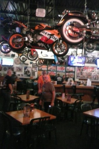 So we went to a "Bike Night" event that was really nice .   There was a band playing rock+roll , bikes of every size and shape (by the hundreds) , and a dinner with BBQ topped Pepper-Jack Cheese Burgers .   here a picture of the dinner :