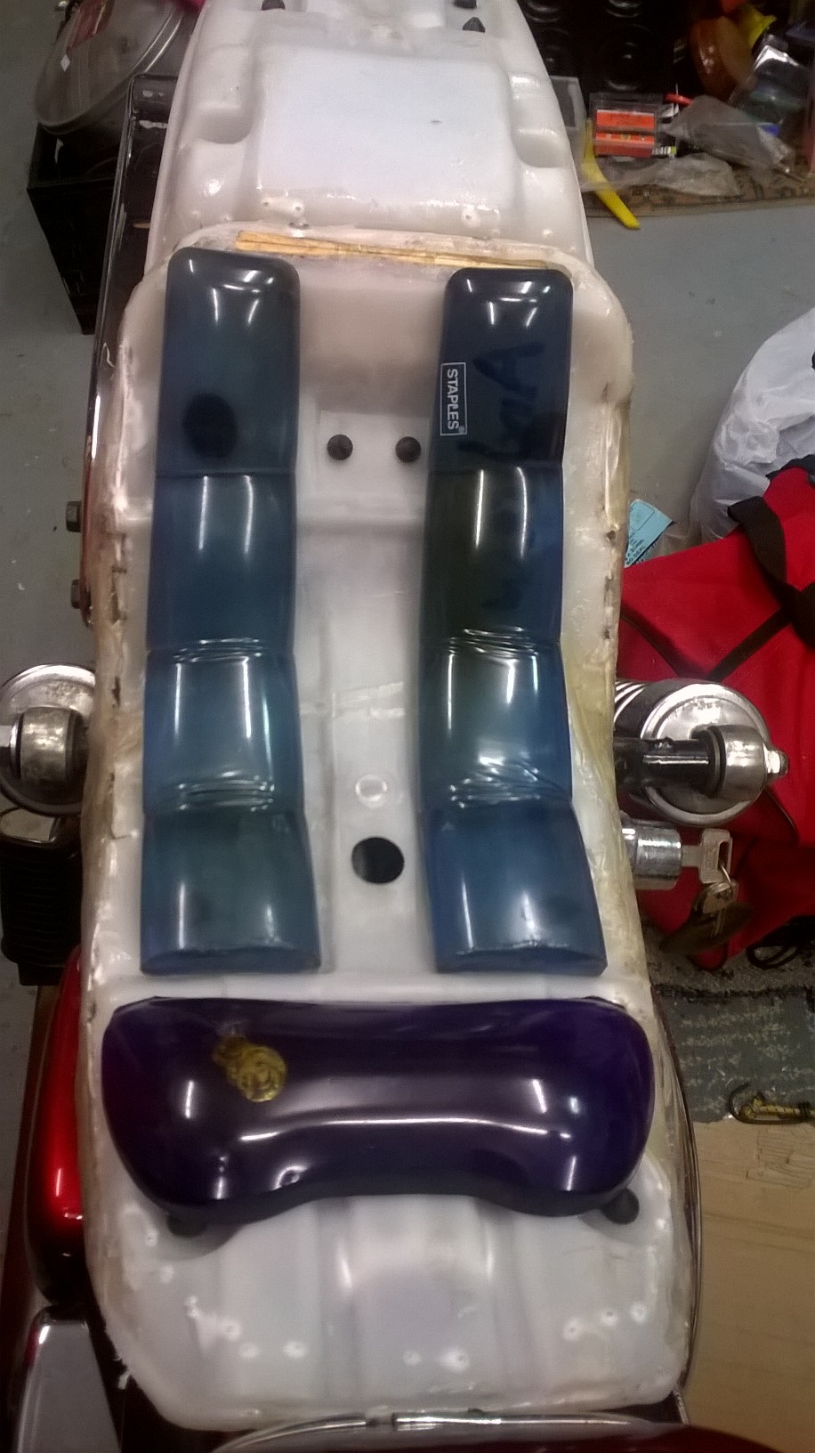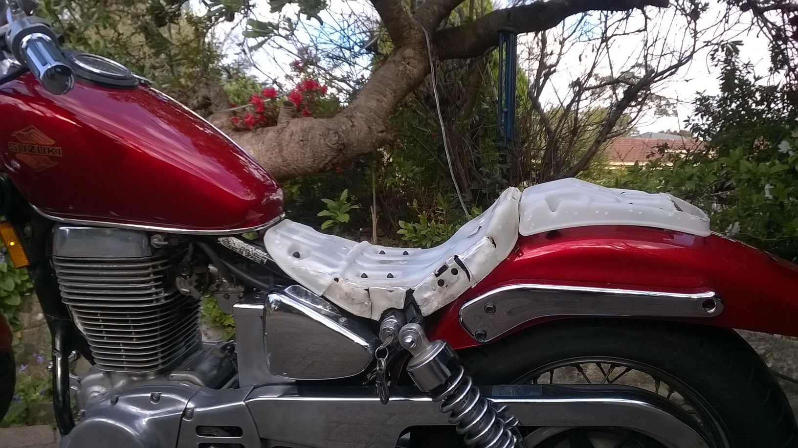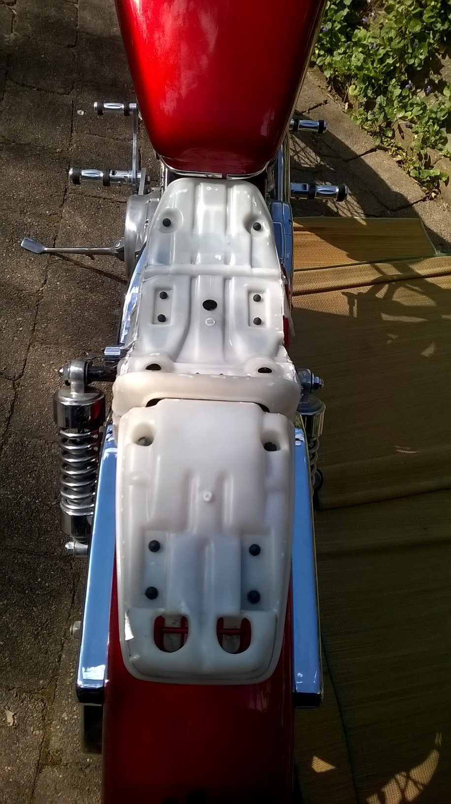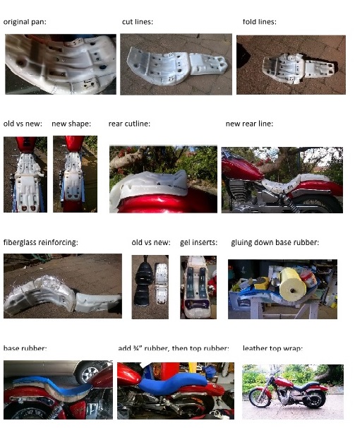 When my seat cover split I decided to give it a new shape while recovering. I cut the original pan down, added gel inserts and foam then recovered in leather.