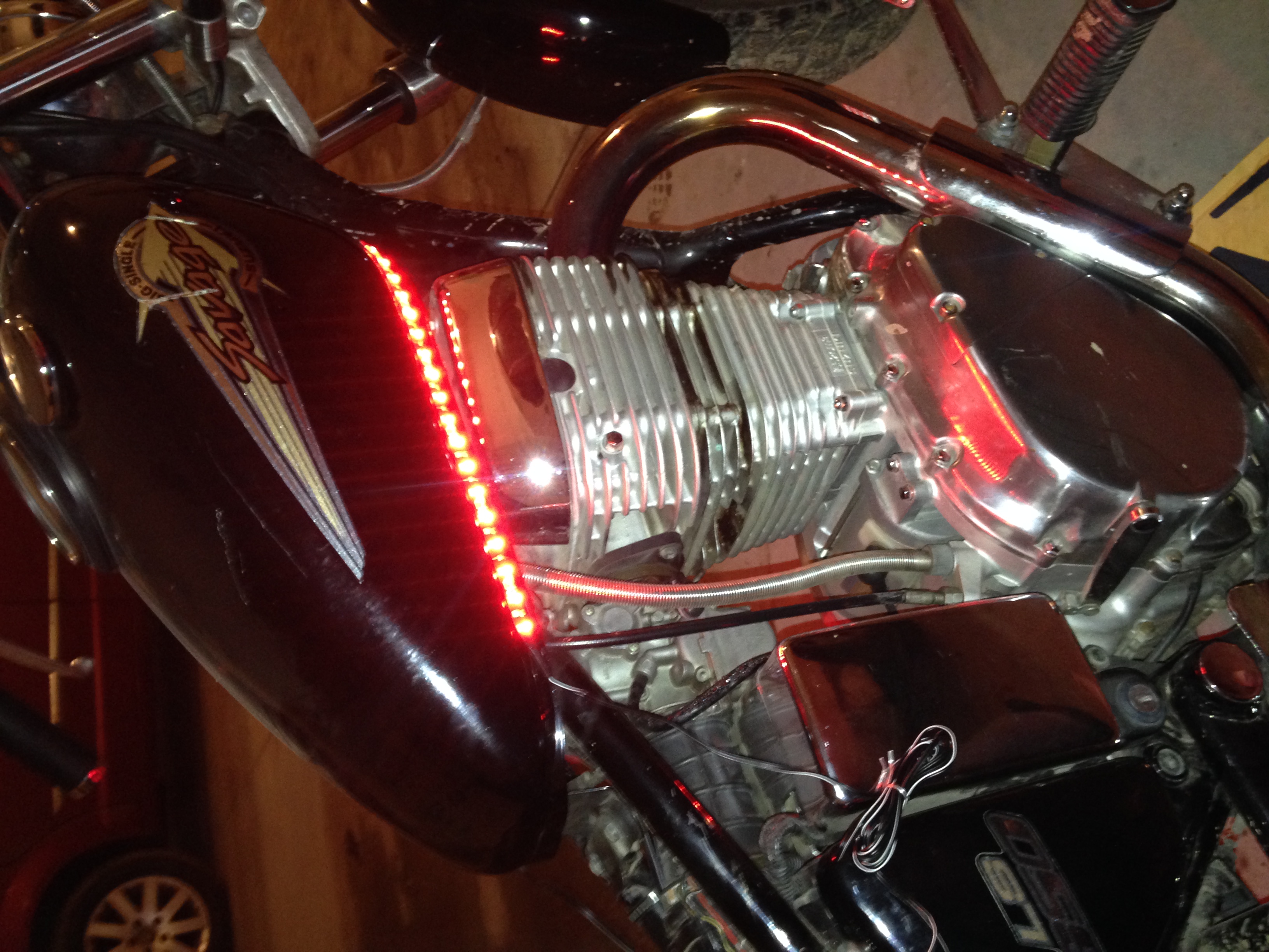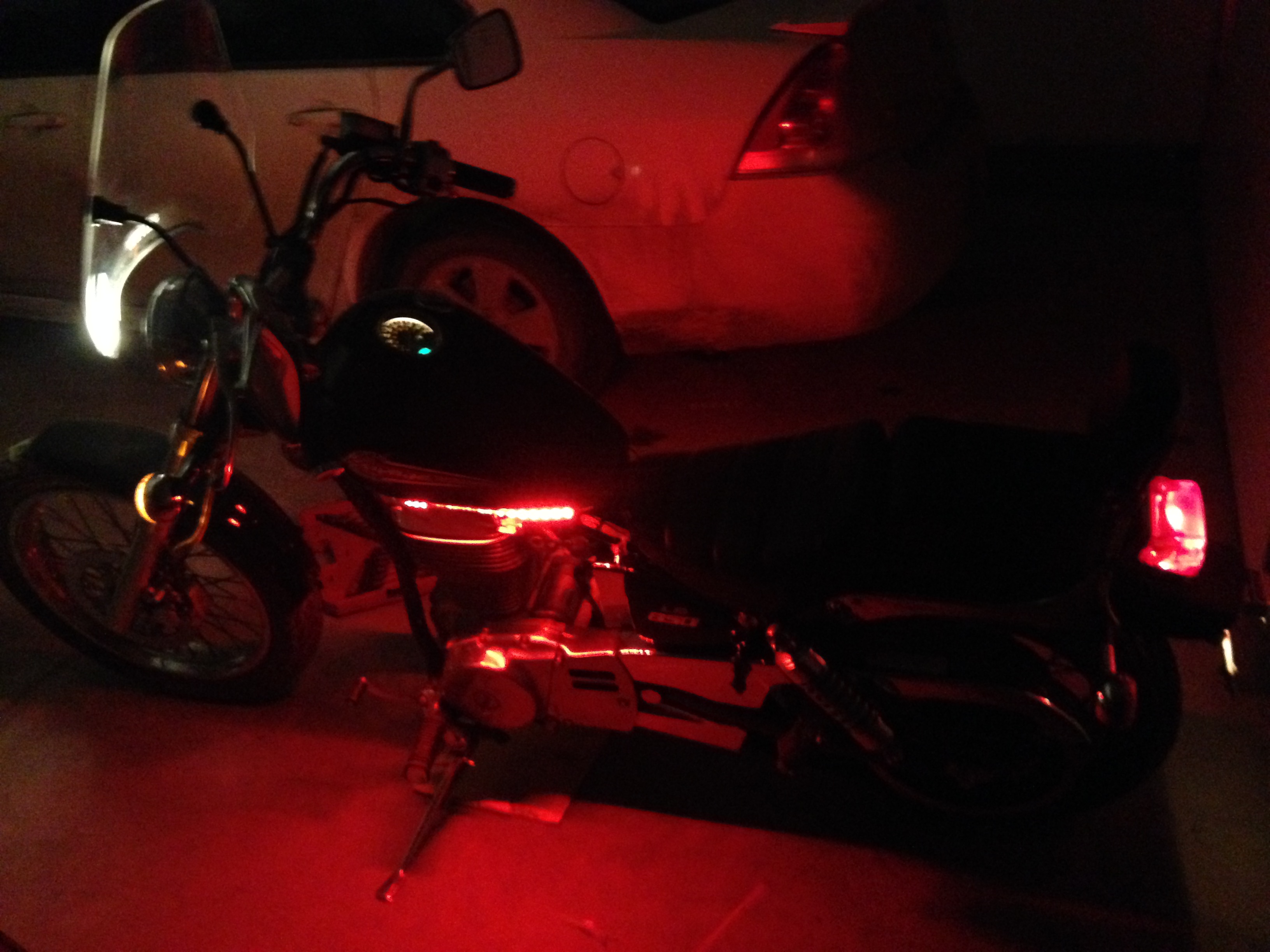 '05 S40, dyna muffler, rejet, high flow filter, Mobil 1 Racing 4T, Shinko 230 set with 140/90 rear, raptor, seat lift, LED running lights/signals, tach, reversed risers, homemade MR10 Lexan windscreen