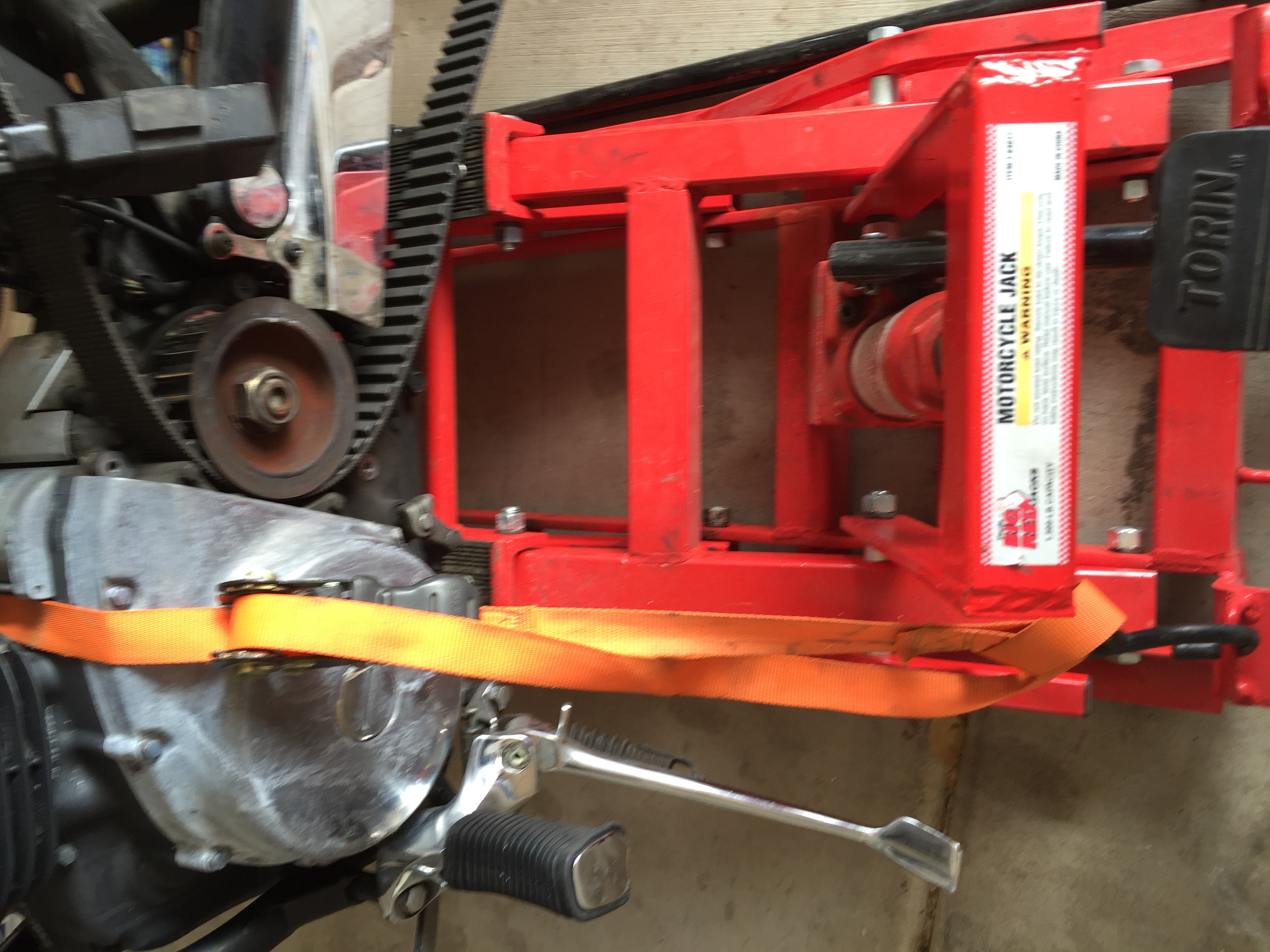 have the same jack i cut 1/2 inch piece of plywood 12x13 inch and liquid nailed to the jack rubbers. just cut a relief for the muffler clamp and shove it under from the kickstand side . put the kickstand pad on a piece of 2x4 it will slide right under . add a few eyebolts to hook your strap too
