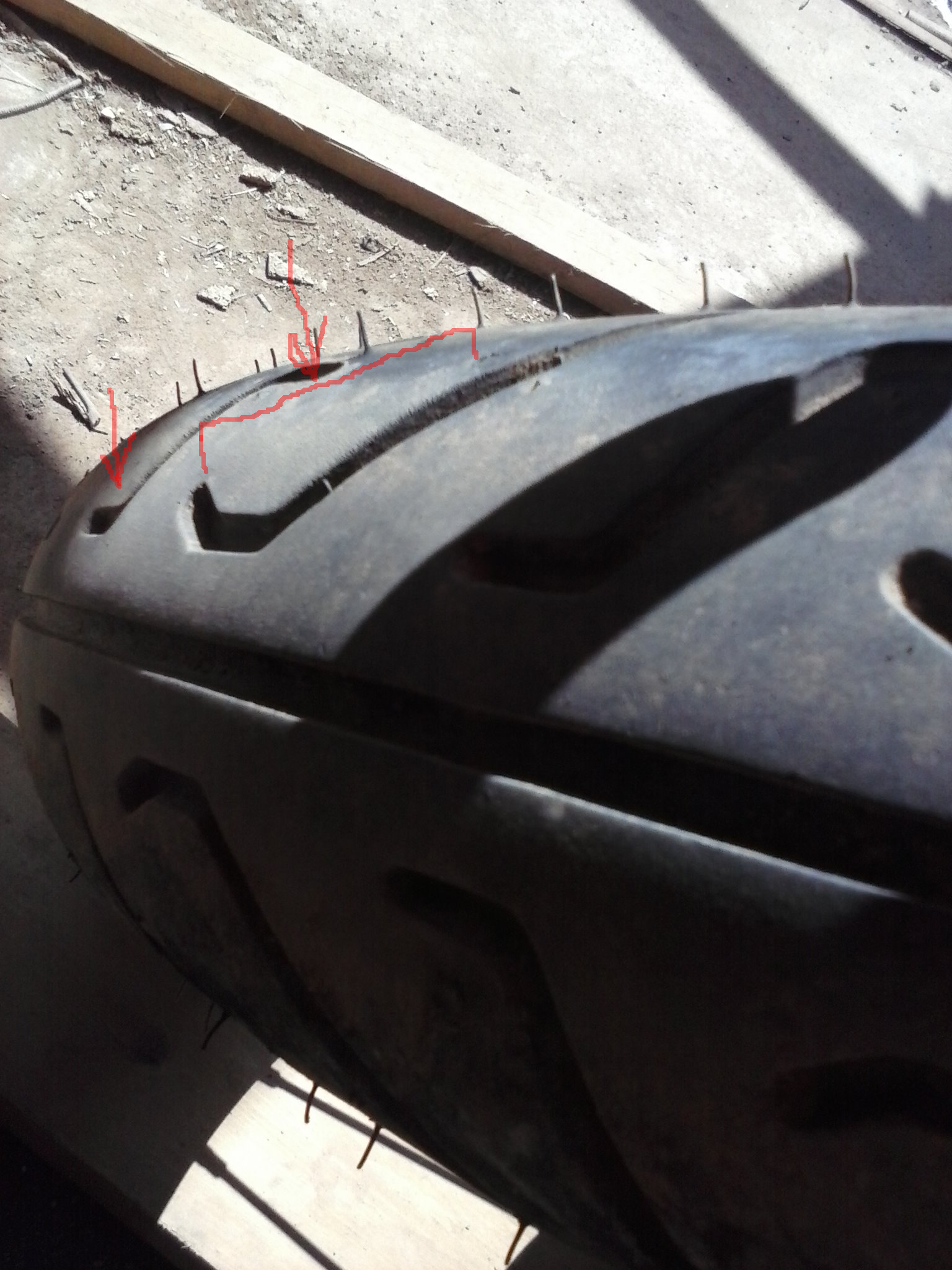 Well, after 2200-2300 miles, I found some wear worth talking about on my Shinko 712 front tire. I found some uneven wear on a certain trailing edge of the tread. I reckon this is the part of the tread that gets the most shearing forces from braking and such. Is this the beginnings of what is called cupping, or is cupping something slightly different? I think I used around 32 psi at first, but lately I have been using more-- 37 psi, according to the latest measurement. The fellow who sold it to me (I don't put much confidence in this fellow, FYI) specifically told me to run it at 40 psi. Strangely, that is also the max cold pressure.