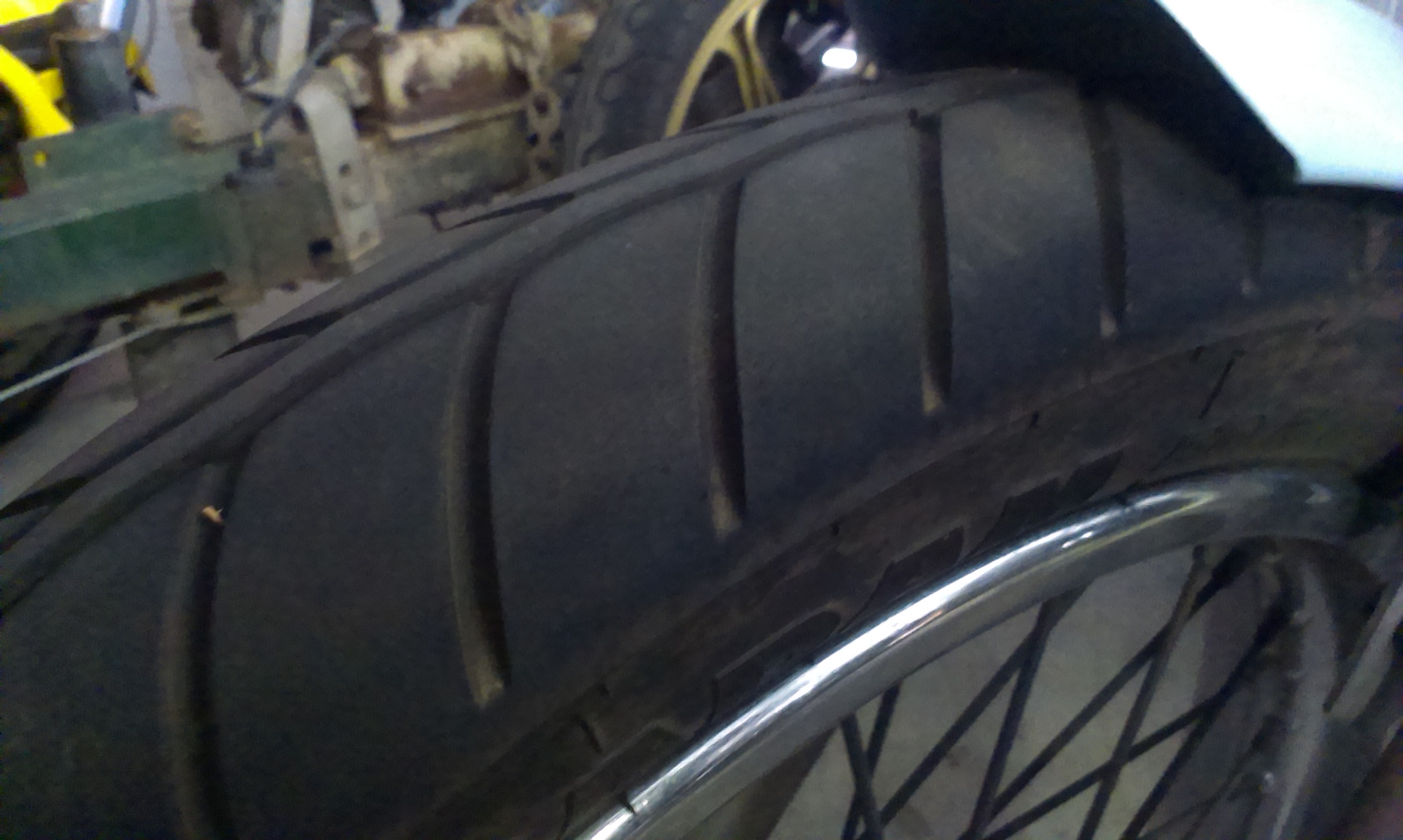Try leaning the bike when making turns , really look at your pics! Next Continentals , Dunlops , Metzlers , etc. When you only have 2 tires that's not the place to skimp to save a few bucks. It could be a life or death decision !