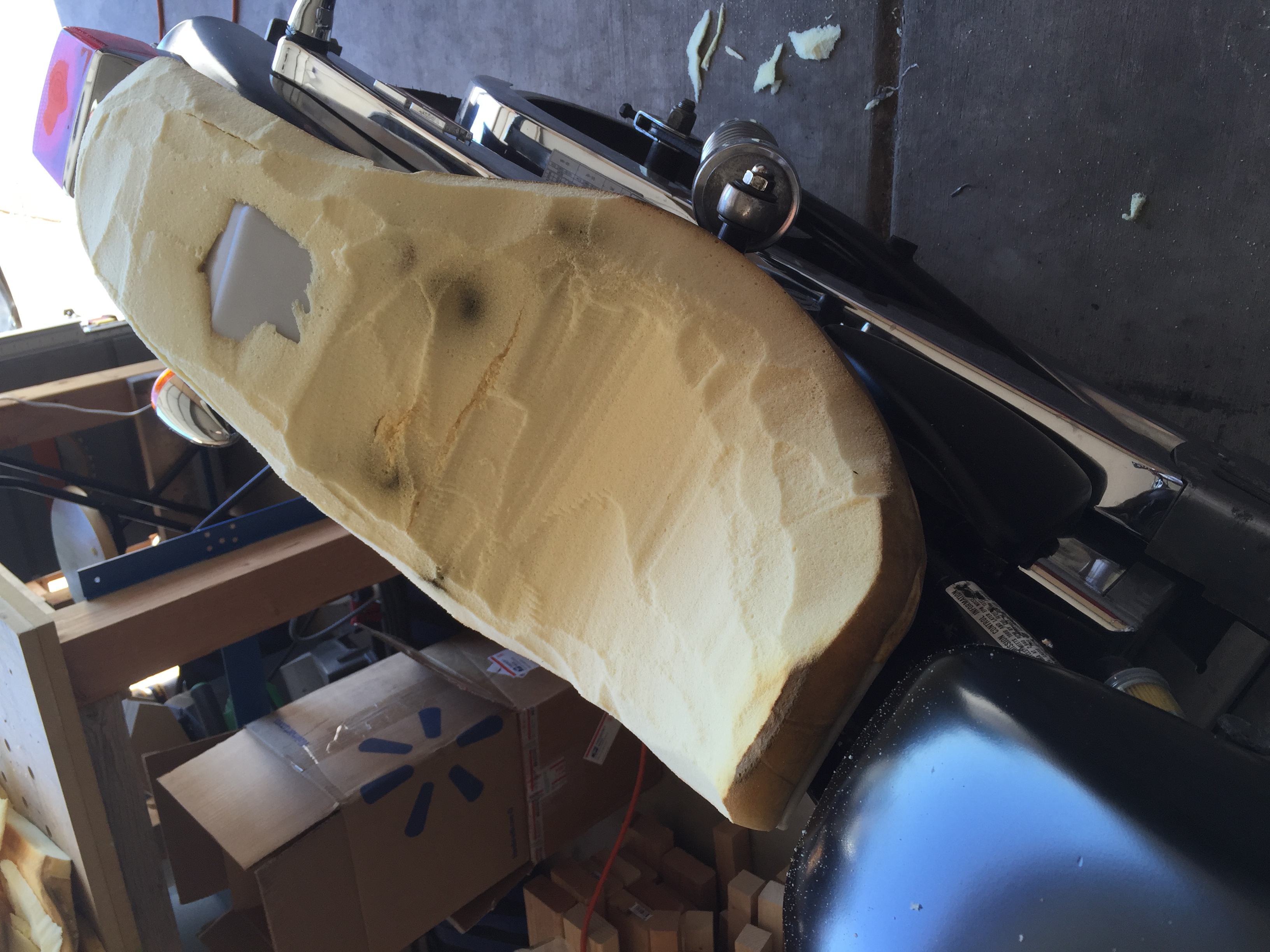 I took over an inch off the foam all the way around. Screwed up over the rear rectifier "hump". it is very thin over that. and a couple other spots are uber thin too. My foam was junk, dry rotted from the sun and was breaking apart as I cut.