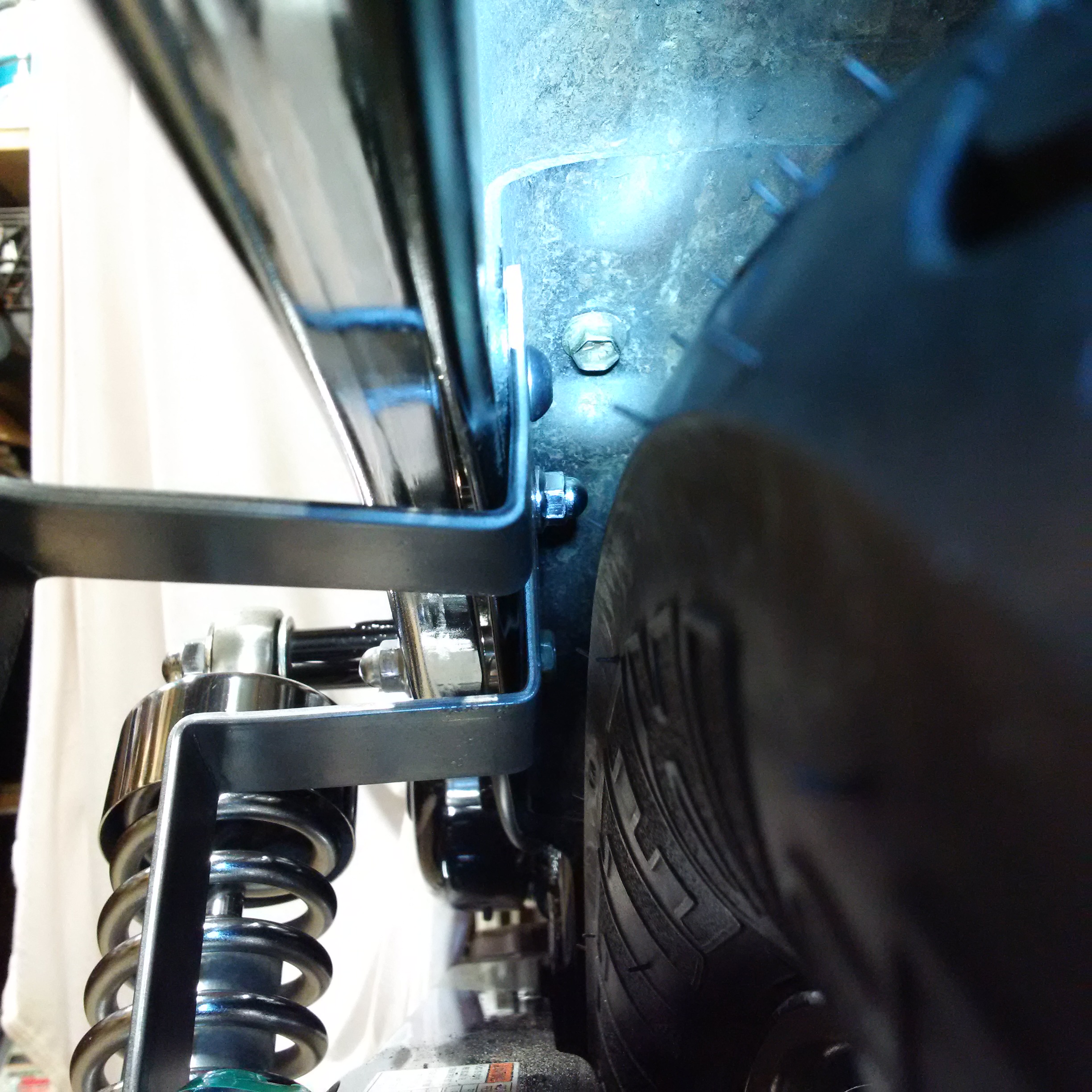 I am having to fabricate support brackets for my new saddlebags (the stock supports don't give enough support) and when I check the clearance it seems that there is roughly 3/8" to 1/2" clearance from the far outer edge of the tire to the near most point on the bracket and/or allen head bolt. See picture.
