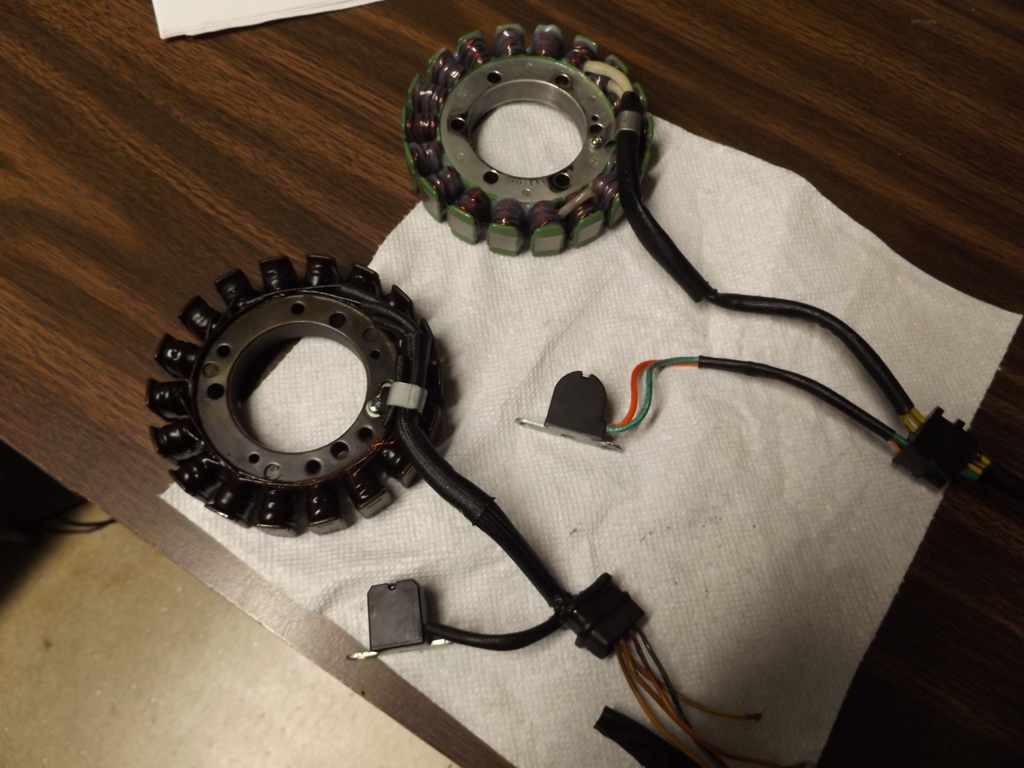 I noticed that the new stator is about 5 laminations thicker than the original.  On the original, they have little plastic guides at the end of each pole. They are close to 1/8" wide on each side.  This one fills that space with extra metal.  It also appears, I didn't measure it, to be one gauge thicker wire.  If so, the combination of extra metal, thicker wire should make for more watts generating capability and hopefully not burn out as easily.