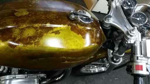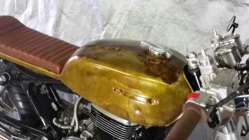 Its a done deal, its there for good. This process actually etches the raw steel where the chemicals react. When you remove your parts from the enclosure you'll be shocked at the amount of corosion that occurs. I went for three hours on my tank, fender and seat cowl. You use the scotch brite to knock off the the high areas from drips and whatever while enclosed. Wash it off good and let it dry. Its crazy what happens after sitting drying in the sun for an hour. Then to seal the steel from creating more rust, clear coat.Here is a close up of the top of my tank where i sprinkled baking soda on top of the vinegar/salt mixture.