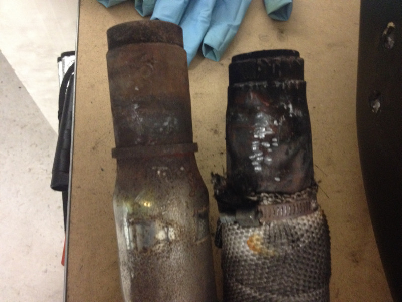 The pipe on the left is bone stock,the one on the right looks like it has been cut shorter and ground down to except an after market muffler.Be aware that header length does have a bearing on tuning, the header length for our motor is between 30 and 34 inches as I recall and I believe Suzuki set the stock at 32 " but you'll need to check "cause my brain ain't what it use to be!.....checked ....I was incorrect the stock length of the header is 30" and should be no shorter than 27"