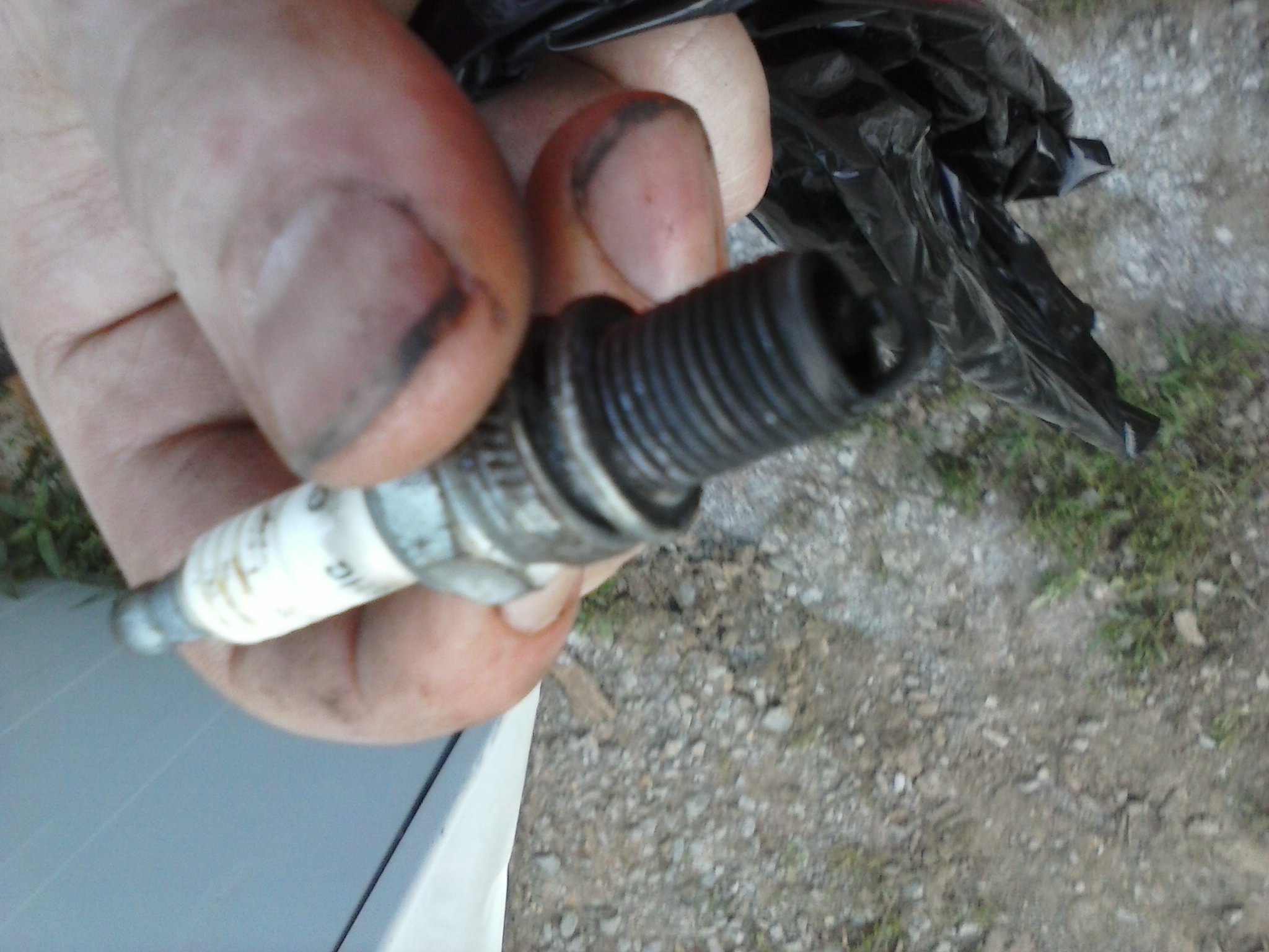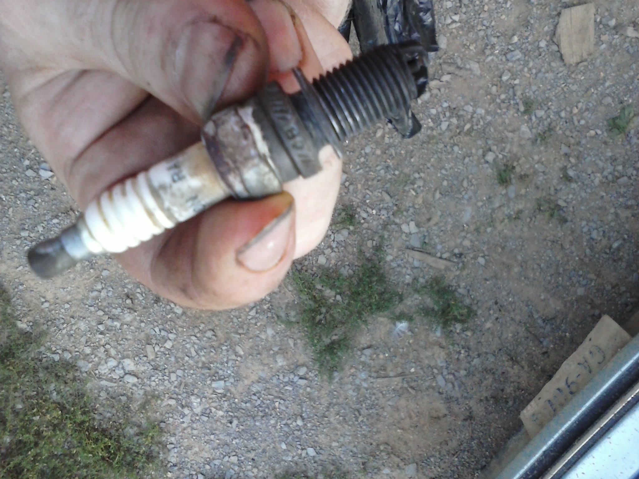 Here's a picture of my spark plug. Looks like its running a tad rich. I'm not entirely sure it was tight. Look at that discoloration around the insulator. I wonder if it is the right model too. I think it's a Champion RA6HC. Didn't check the gap.