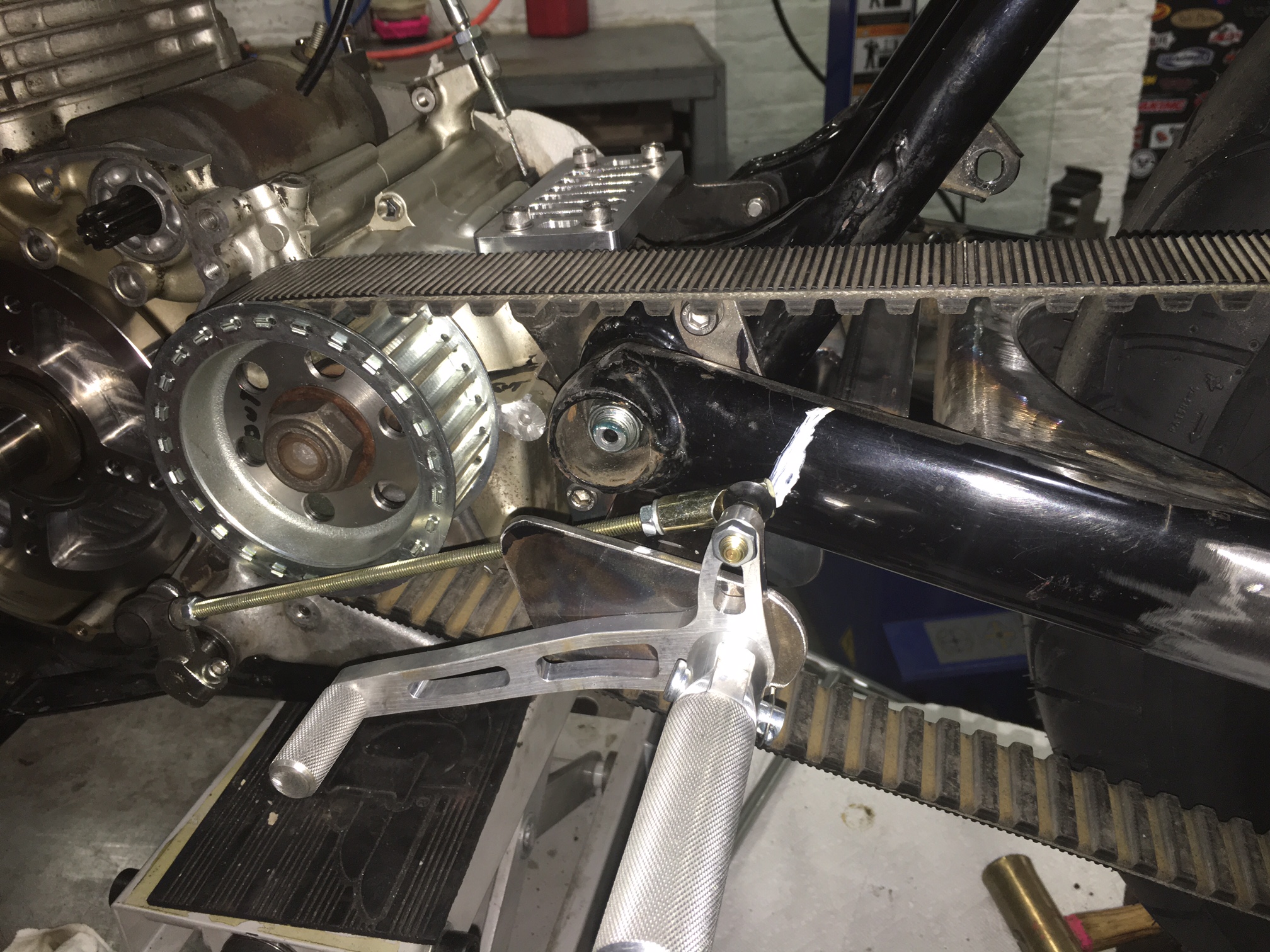 So, I put on the +2" RYCA shocks along with an 18" rear wheel to pick up the ass end of the bike. Chopped up and braced the swingarm (to make up for the metal removed).Putting it all back together, I figured I'd do a bit of head scratching on the belt tension.