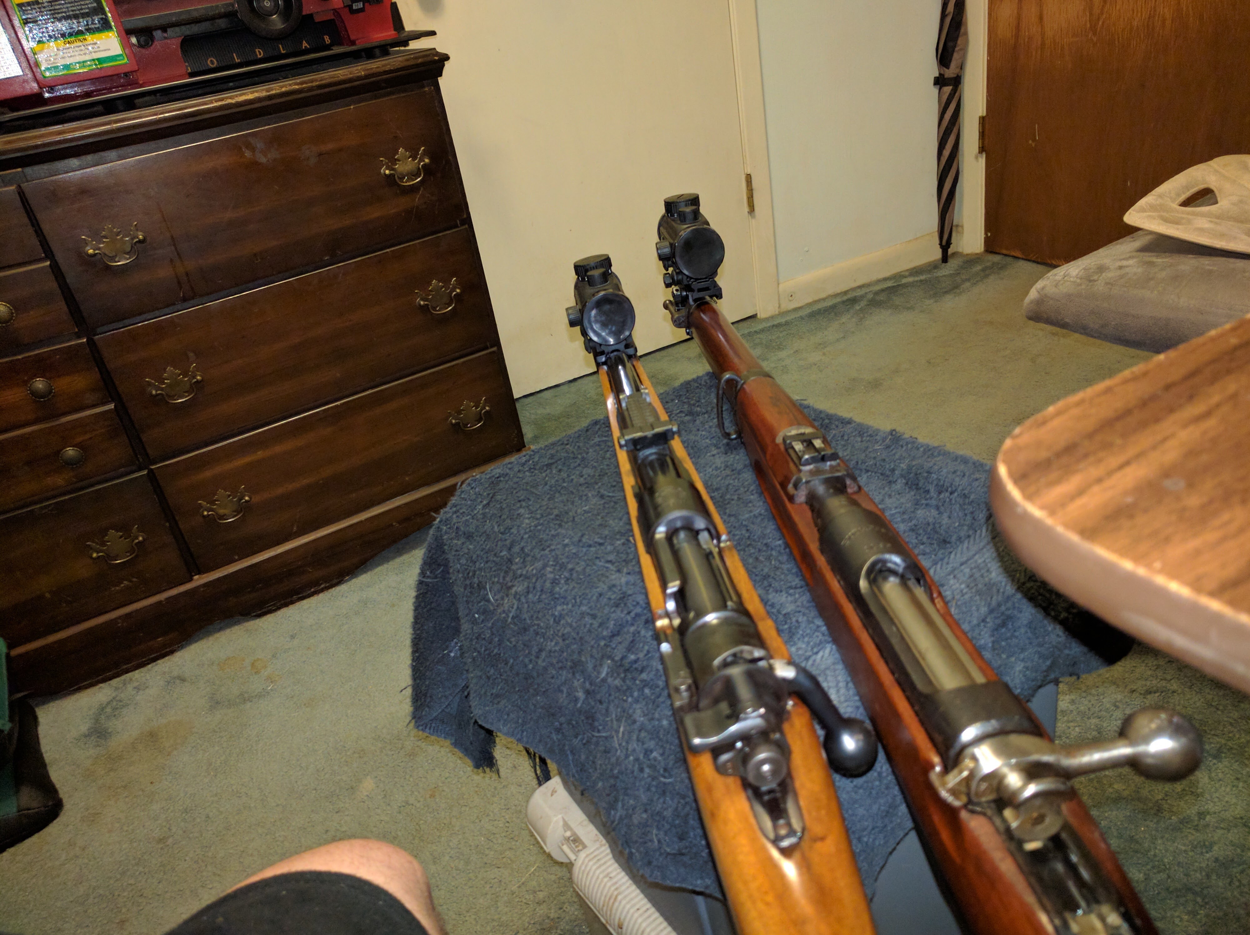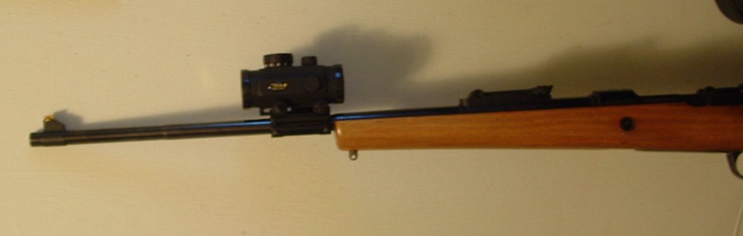 Result turned out better than expected, the barrel clamp Weaver rail is actually lower than the Mauser sights, so when taking the dot scope off (a quarter inserted in two slots) the gun is "natural Mauser" again from the operator's perspective. Nothing is affected mechanical sight wise, the elevation ladder still works, etc. etc.