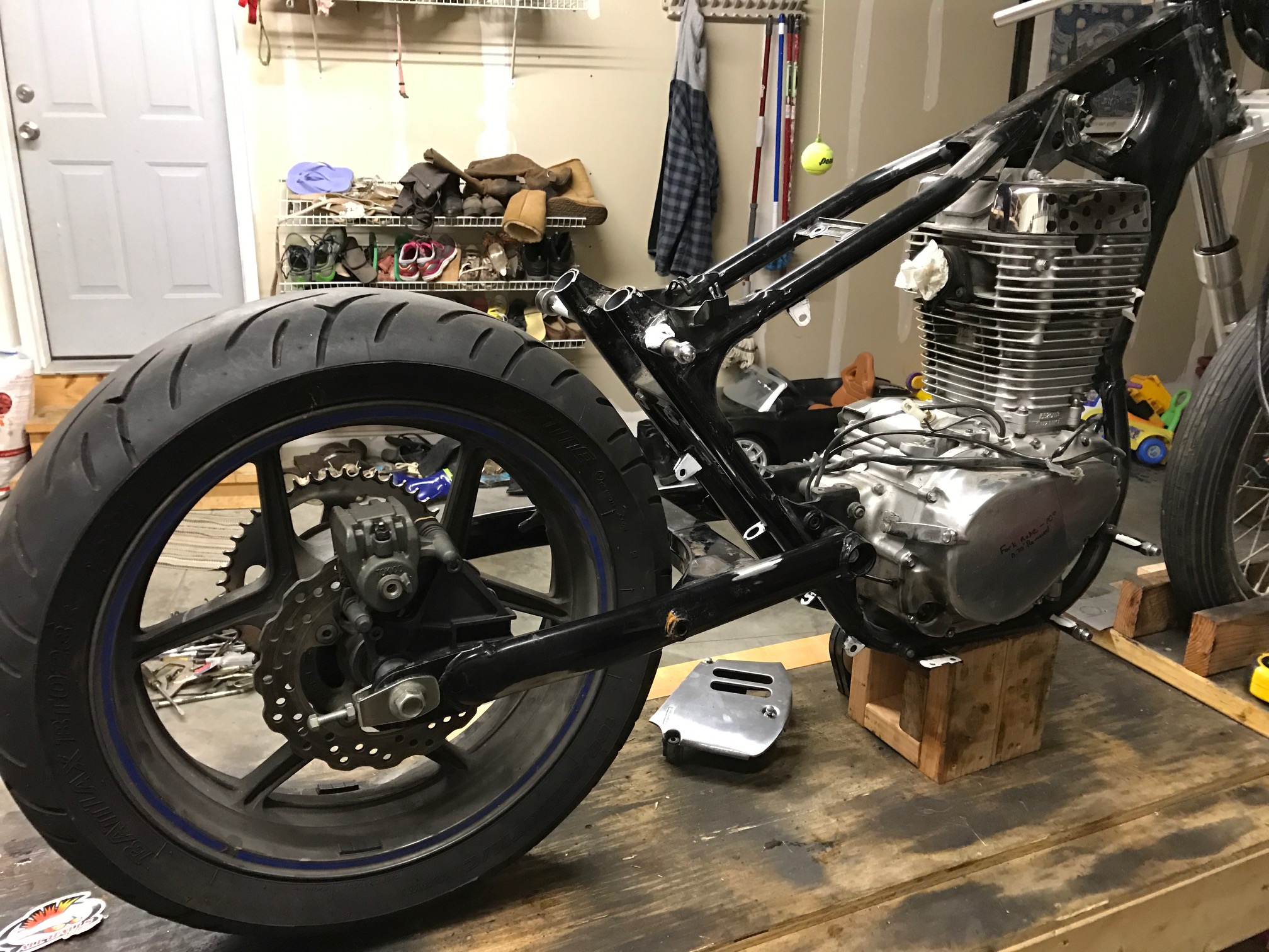 I've seen the topic of rear disc brakes come up several times so I thought I'd broach it on a savage that recent picked up. I've built a couple cafes with an ls650 in the past and always kept the wire wheels. Trying something different this time, so far so good.