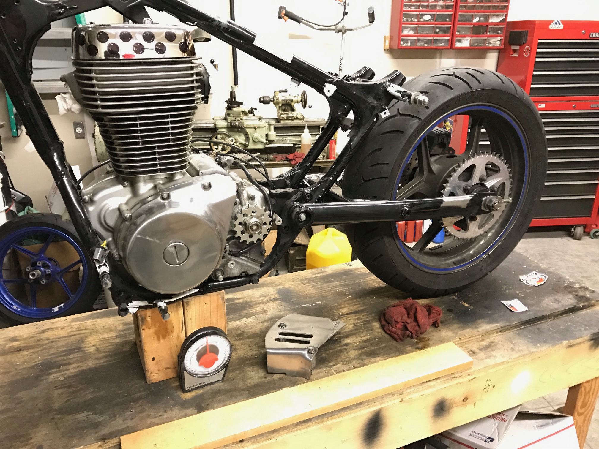 I'm actually using a EX650 ninja rear wheel which is all mounted up and appears to be positioned centered in the fame and within a .10" inline with the sprockets. I haven't visited the rear sets yet though I have a couple sets of the Loaded Gun's which are nice. The front will be a ZX10R wheel with single 320mm rotor and hopefully radial mounted rotor.