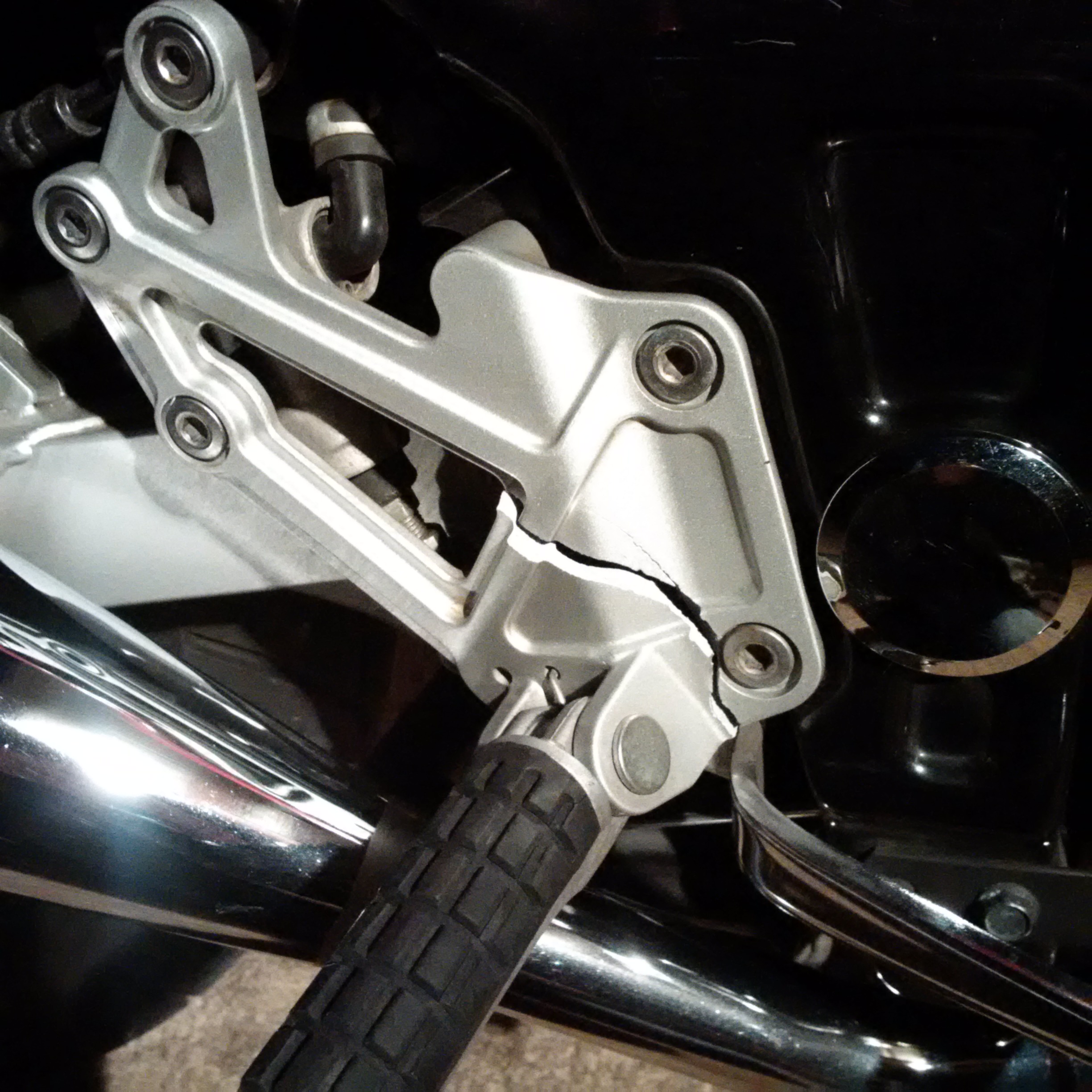 Looking at your footpeg mount....it appears that the deer hit that area pretty hard.  The peg is supposed to fold.....before it breaks stuff????  The deer could have been pushing down and backward - which is not the way the peg folds.