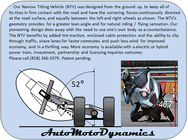 I don't see this NTV concept as really workable ,they're showing a lean angle of 52 degrees ,unless the base platform is highly weighted what's keeping the rider from hitting the road? These people are putting out minimal info ,fishing for investors ,in a project I think is doomed to fail.If this design is workable,show me a prototype,not a silly drawing! Their drawing shows the center of gravity (the symbol -a circle with four quadrants),outside the two front wheels,which would make the inner front wheel a fulcrum ,were as the two wheeler next to it has the weight directly over the wheels no matter what the lean angle.the Piaggio mp3 works because they run motorcycle tires that lean in such a way as to equally stay in contact with the road ,thus the center of gravity stays in direct line with the bike .