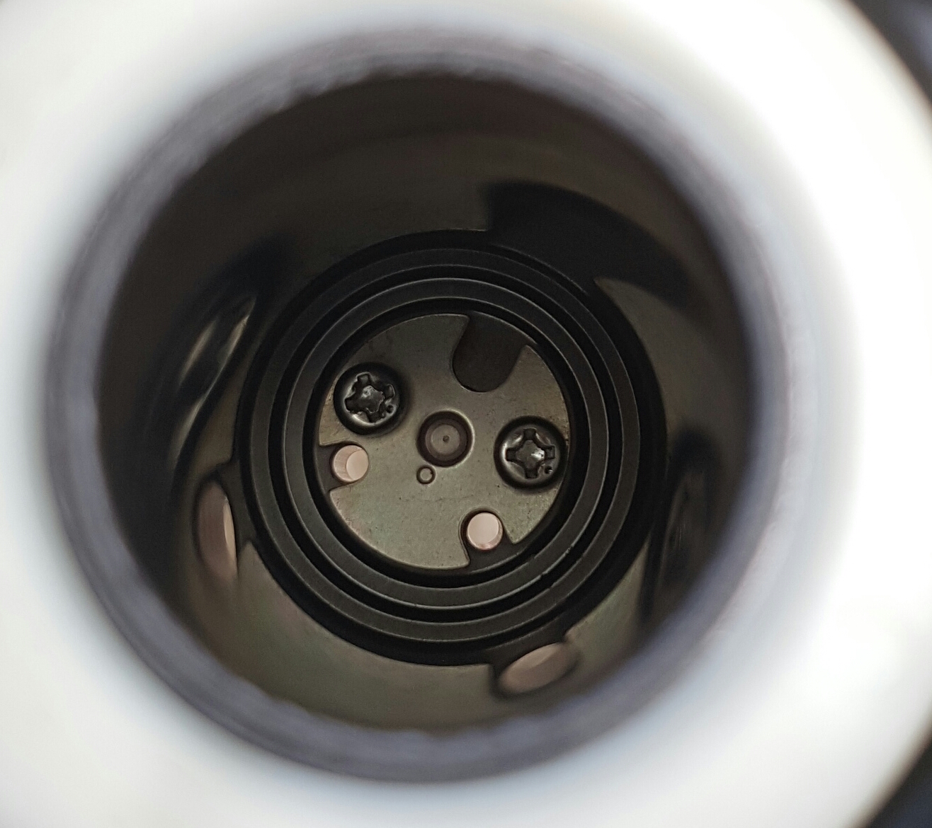 This is looking down into the diaphragm. The two small screws hold the plate in place.  In order to get the plate on, you have to put pressure on it because the spring is pushing upward against the spacer from underneath. You can see the spacer down the centre, and the needle in the centre of that.
