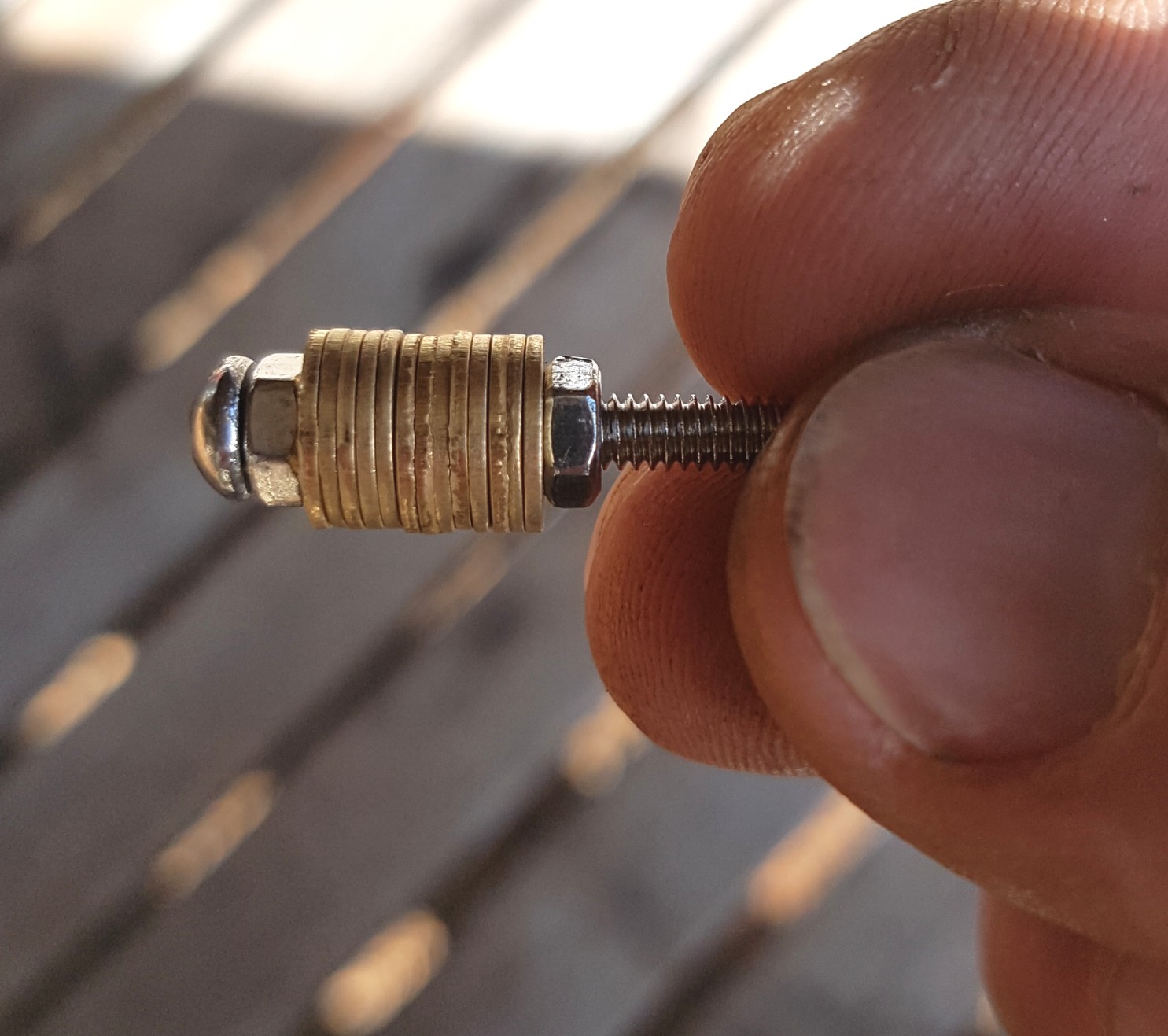 When you remove the white plastic spacer - The brass washers are thicker than the steel #4 washers (and larger diameter) - so if those are the only ones you can find, you should start with using only 2 washers instead of the 3 washers that we normally recommend as a starting point.