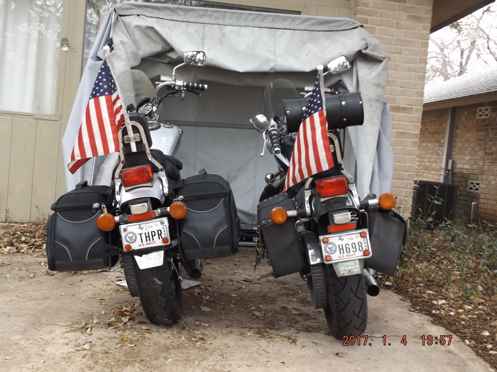 I like the way you got them clear of the shocks. Mine have a bad spot from shock rub now. I've tied them together at the rear (over the tail light / under the luggage rack) to keep them from shifting forward again.