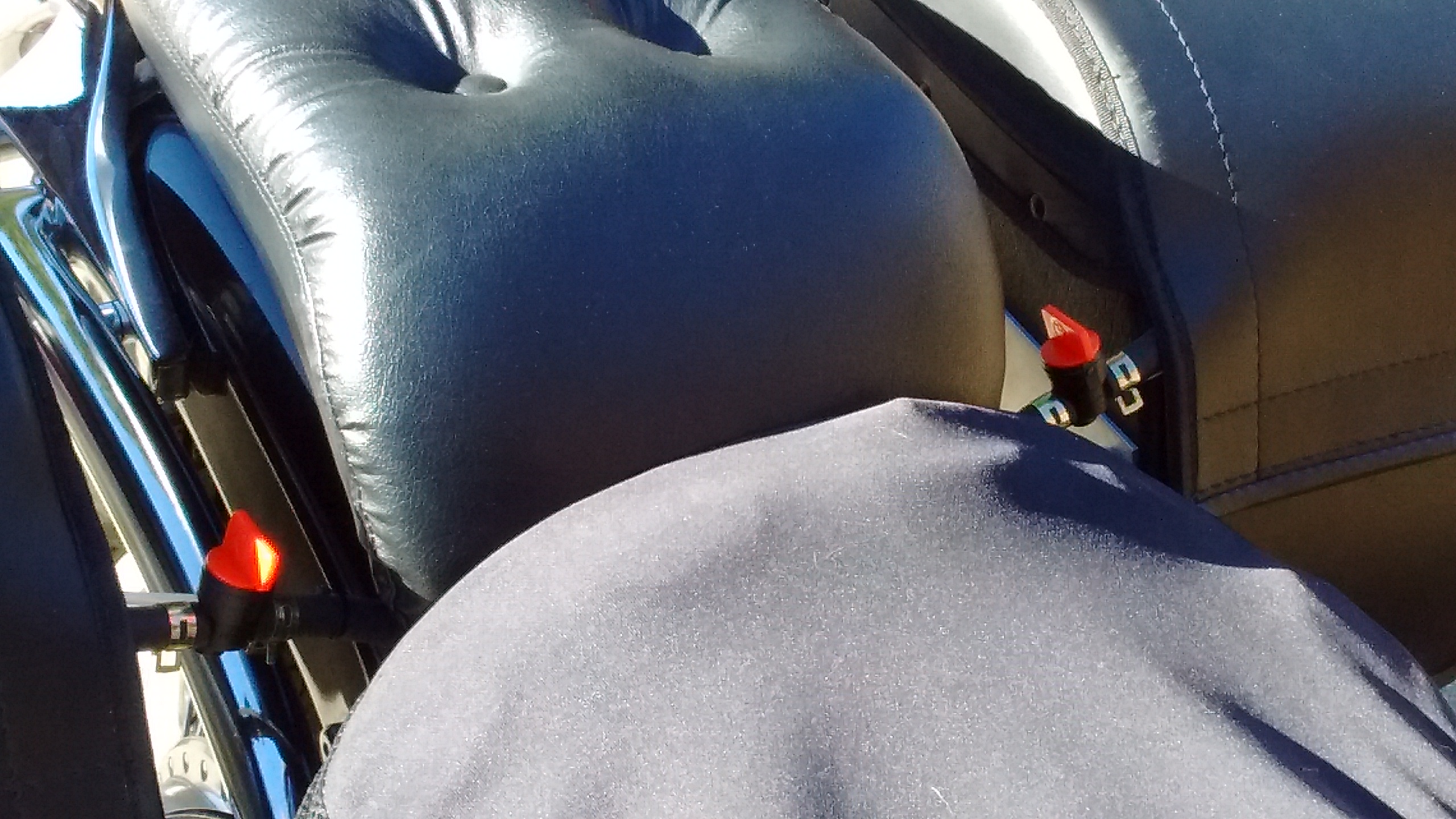 This shows the on-off taps just outboard of my wallet pockets --- easy to find while riding.