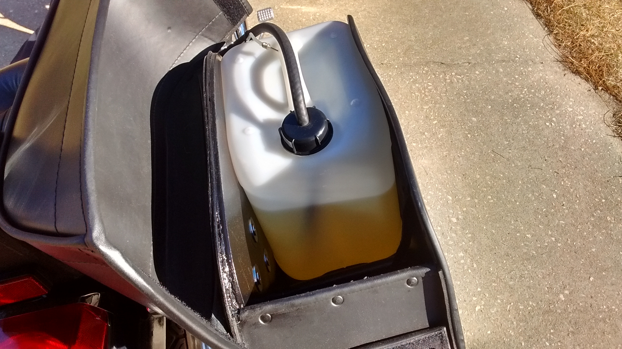 Gas station first, filled the steel main tank to the top and yes indeedy it would back flush all the way to the jugs with no issues.   Put in a half a jug of gas into each side and watched them nasty air bubbles back flush out of the system just as pretty as you could please.   Then cut the taps all off and filled up all the jugs/tank completely and then I turned on just one jug and pulled out and rode off onto the new interstate bypass for some steady high speed testing to see if I was going to be getting enough gas at speed (no stumbling or surging) off of just one jug.