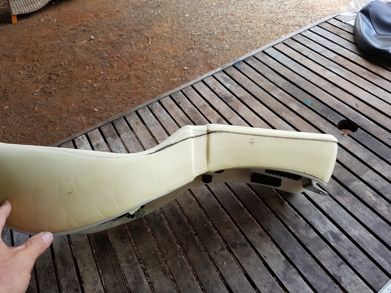 There are some significant limits to how much you can cut off because of the shape of the seat pan, which accommodates the rectifier and the wiring under the seat. I'm trying to achieve this without moving all that stuff ... if possible. So, at this stage of the project the pillion seat is pretty much unusable. However, the ridge at the back of the drivers seat is now far enough back to give the tailbone relief. But, if you push back onto that ridge, there is almost no foam there either, so it's pretty hard.