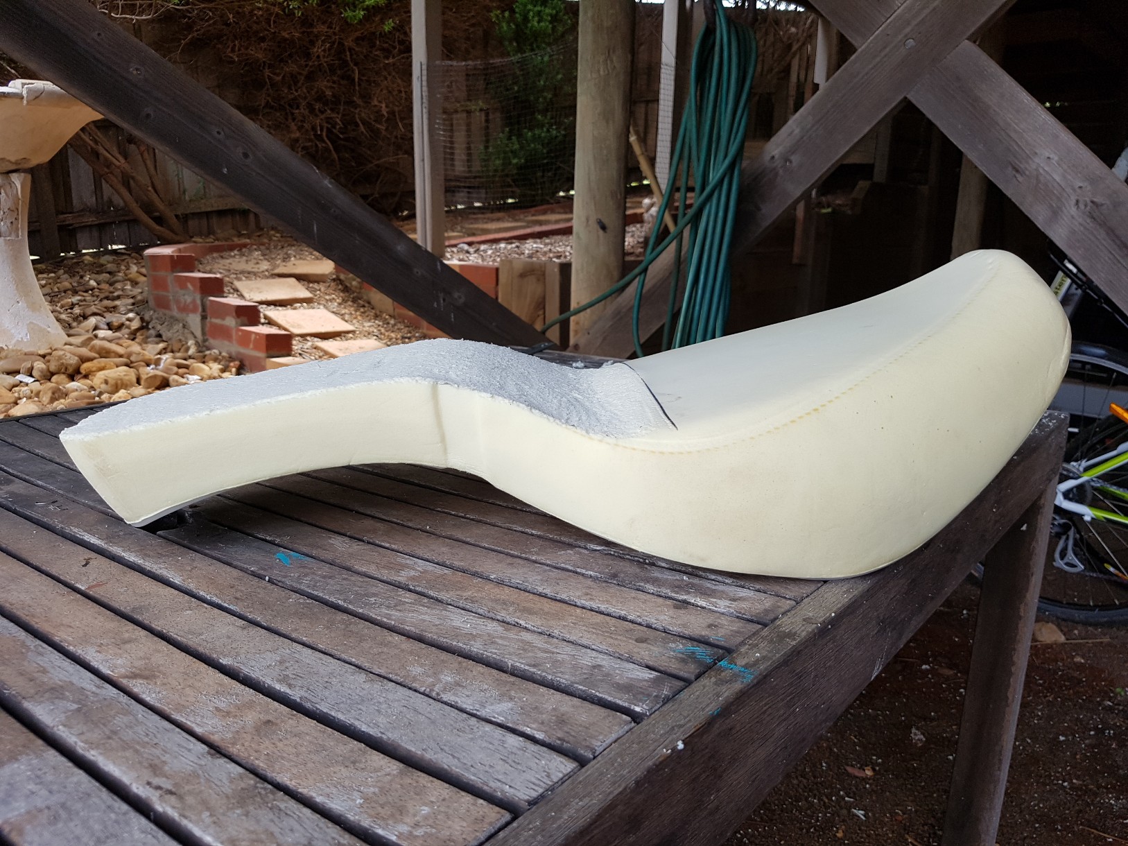 I've begun experimenting by cutting down the stock seat so that all the experimenting is done before I go to the auto trimmer to get it done properly. I'm doing it in three stages: