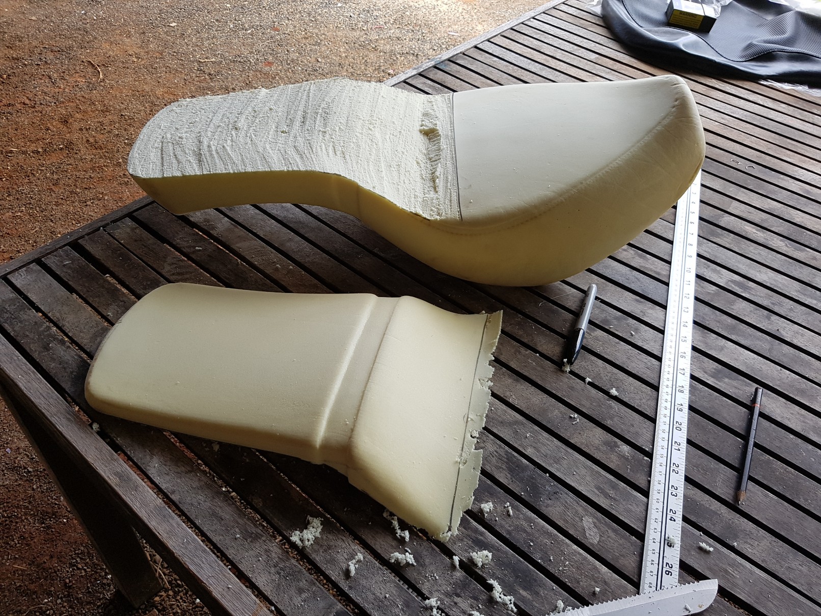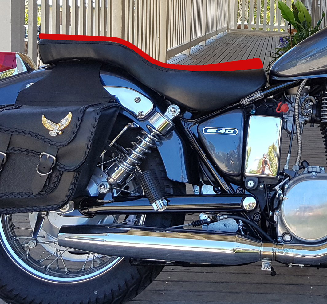So, I reckon I need to cut the pillion seat down by about an inch, raise the drivers seat foam as high as is practical, and smooth out the curve between them. That should do it. Very similar to a couple of mods that have been posted in this thread - so I know it can be done  Smiley