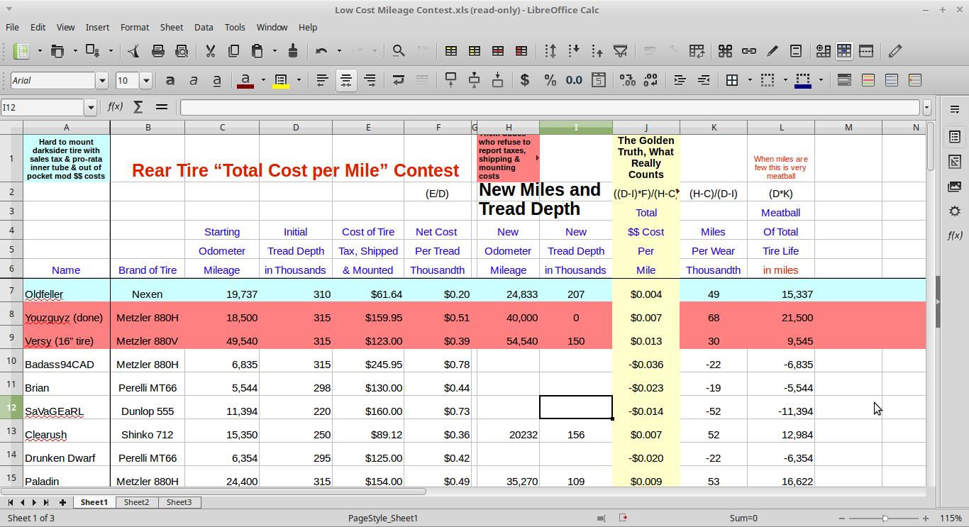 My rear tire is still in play in the contest, but all the rest of the people that entered have replaced their rear tires since then, sold their bikes or dropped off the list, so by default my 0.4 cent per mile real cost of ownership was the grand winner of the people actually entering real bikes with real non-imaginary (non- remembered) real bike mileage.