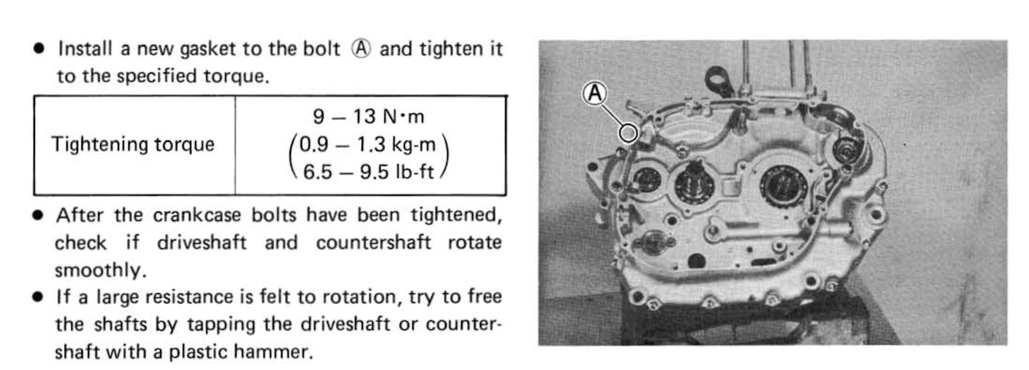 2) The service manual mentions putting a new gasket under this crankcase bolt (in the pic I attached) and clymers (pg135) mentions putting a new sealing washer under the rear right hand bolt. They point to different things and none of the OEM part listers show anything of the sort. Anyone got a part number on this mystery washer/gasket