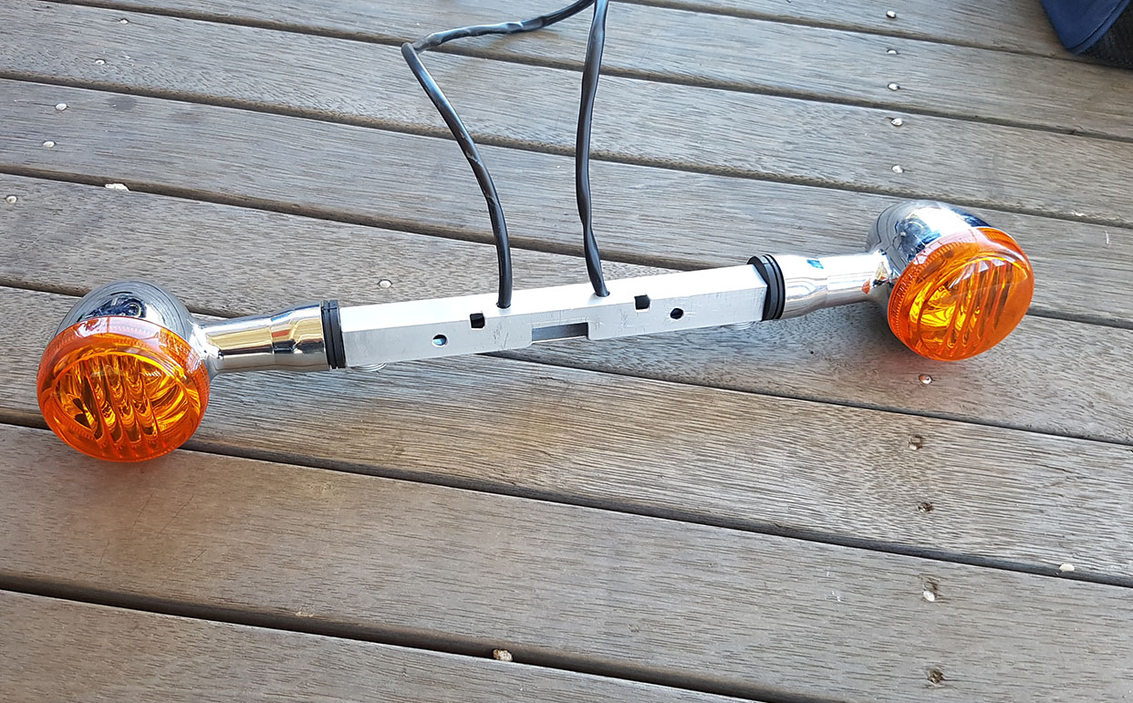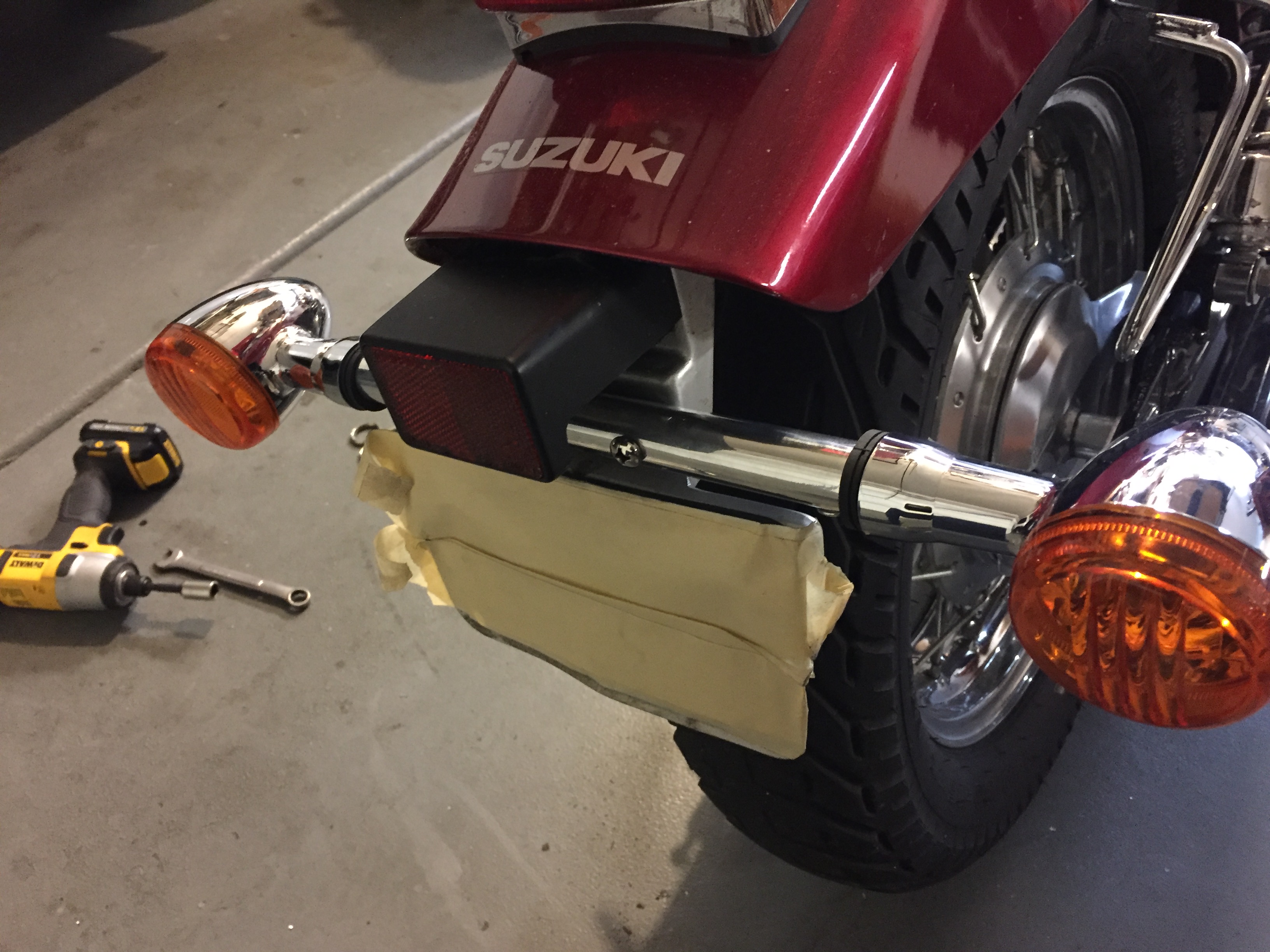I found some square section aluminium which the turn signal mount fitted into (with one washer to snug it up). Mounting to the licence plate bracket tilted them up a bit, which bothered me at first, but hey, at least they point straight at the driver behind me