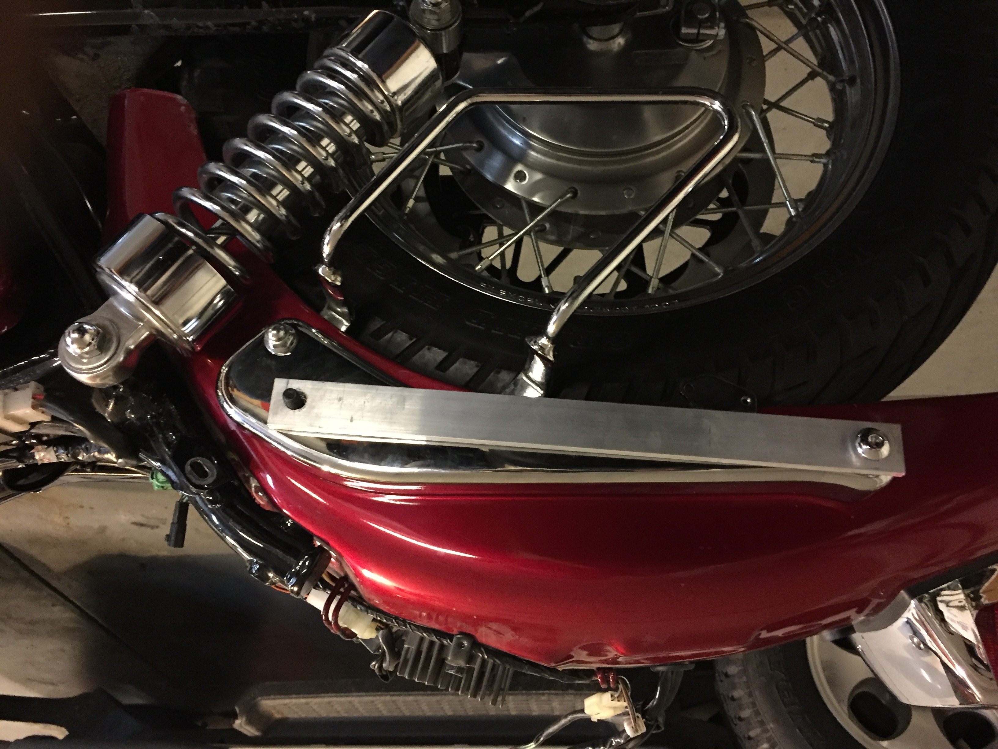 Next I used 1/4" X 1" aluminum flat bar with washers behind it to space it out from the chrome fender covers (so the chrome wouldn't get scratched).