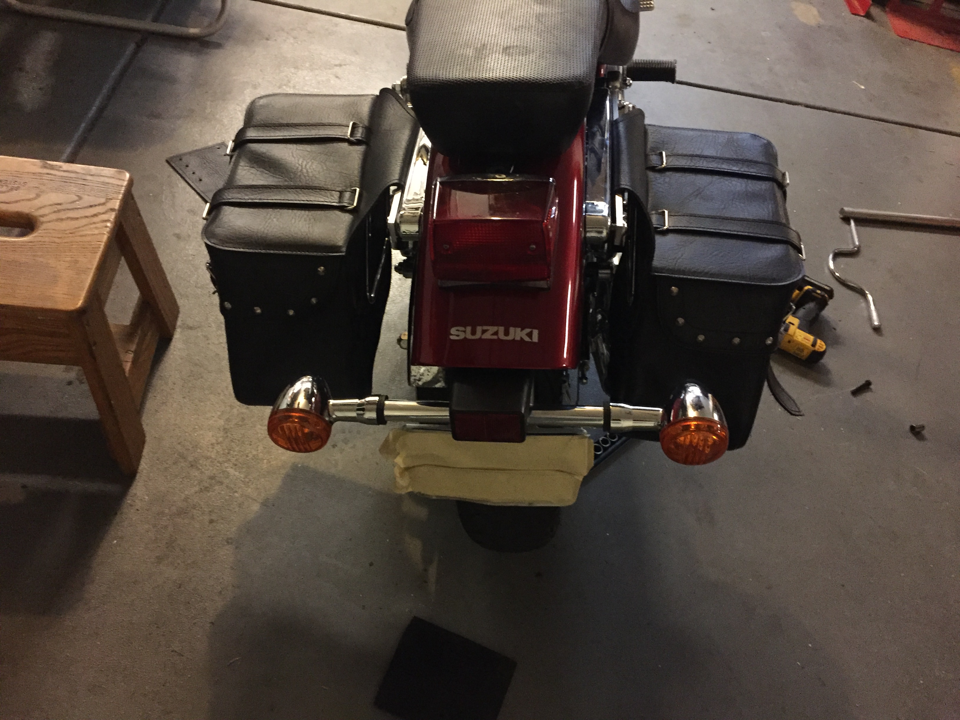 I found some saddle bags on auction for $50.00. I wanted to mount them low and out of the way so if anyone is interested I started by relocating the tail lights. I had some 7/8" OD 3/4" ID aluminum tubing the tail lights would fit inside. I drilled holes in the tubing in order to hold the taillight in and holes that lined up with the rear reflector mount. Then I polished the tubing to give it a finished look.