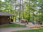 Cabin #2 - there is room for an additional small tent if you want but it can not be set up on the grass (only within the gravel pad). So it does make the eating area a bit cramped. Nice view of the lake but a longer walk to your car and the bathroom.    I also see a fire pit and firewood .....