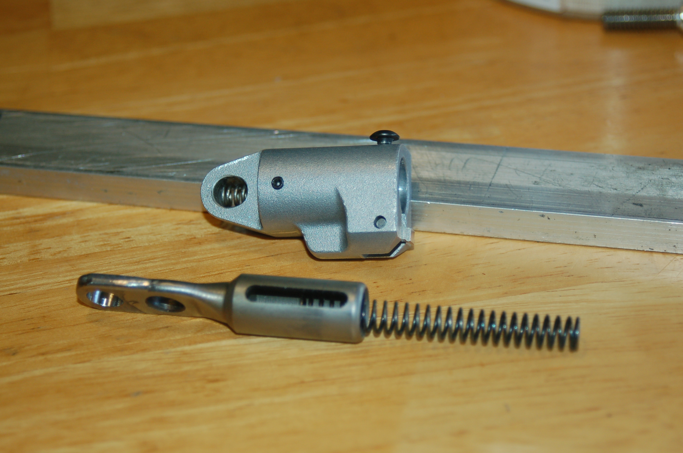 The secondary spring hole (approx. .255 Dia) was drilled down through the existing plunger hole down into the mounting hole.  I then placed the spring in there, and then put a washer which has a beveled edge in flat against the bottom of the plunger hole.  I then drilled and tapped two side holes at a crucial spot so that the cone pointed 6-32 set screws would "lock" on the bevel of the washer.