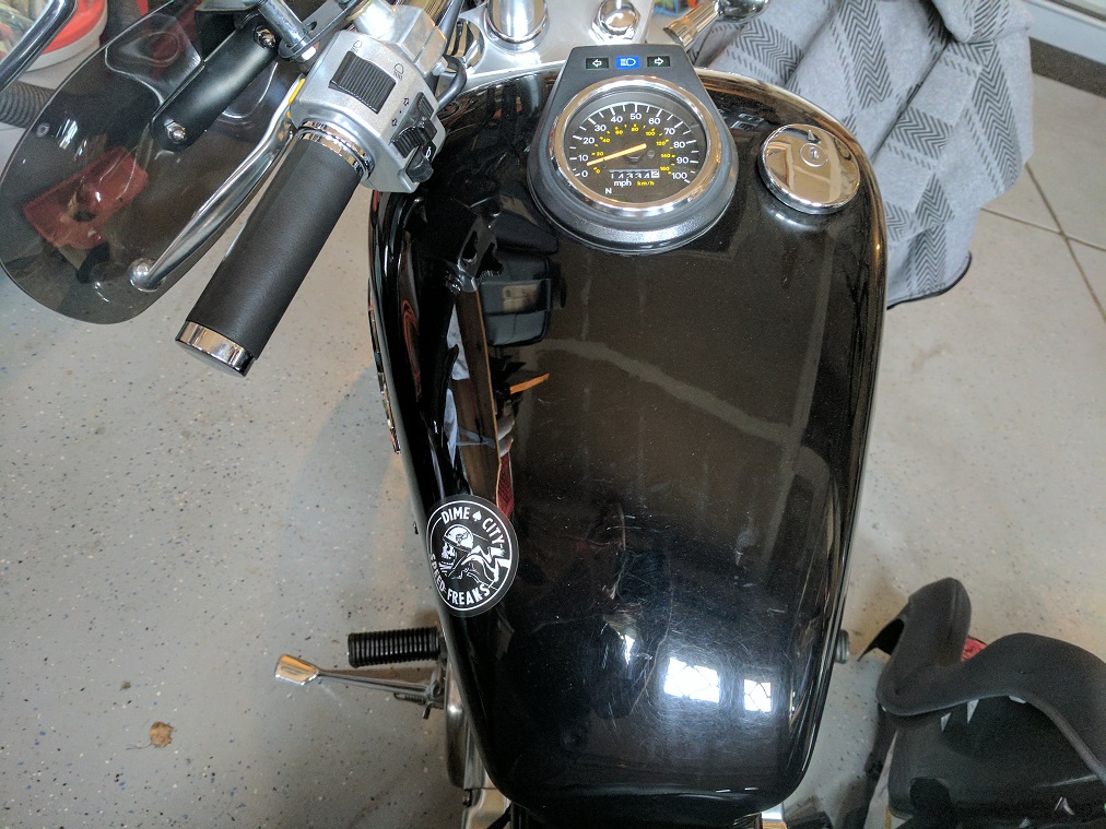 But Dime City Cycles sent a decal when I got my headlight a while back so I stuck it on one of the more noticeable dings. Didn't really want decals on my bike but I like the way this one sits off to the side and it covers the scar.