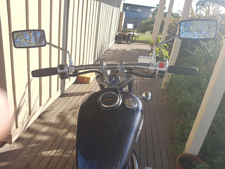 I found these bars at a bike accessories shop, with a HD section down the back. I think they're a generic type of thing. Man, they make a big difference. My shoulders open up and they pull me forward on the seat a bit too ... that's a good thing as far as I'm concerned. The difference for slow riding and slow cornering is just terrific ... more leverage.