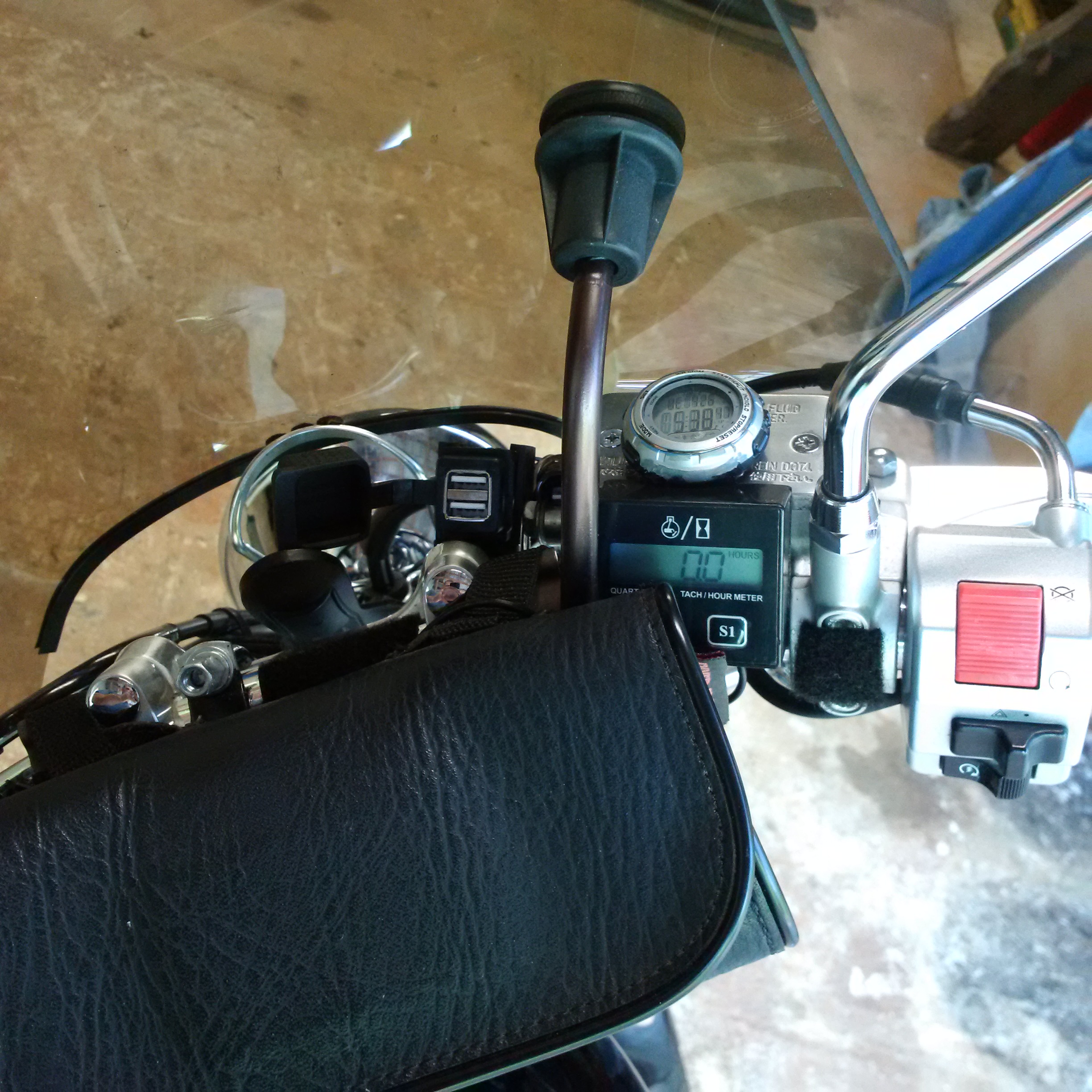 Lastly, I put the "rough" side of the velcro on the tach, and the "soft" side of the velcro on the handlebar and upper rear side of the brake fluid reservoir. Attach and you're all set.  Should you need to access your brake fluid reservoir, just use a razor to make a cut where the cap needs to separate from the reservoir and it'll lift right off and go right back on.