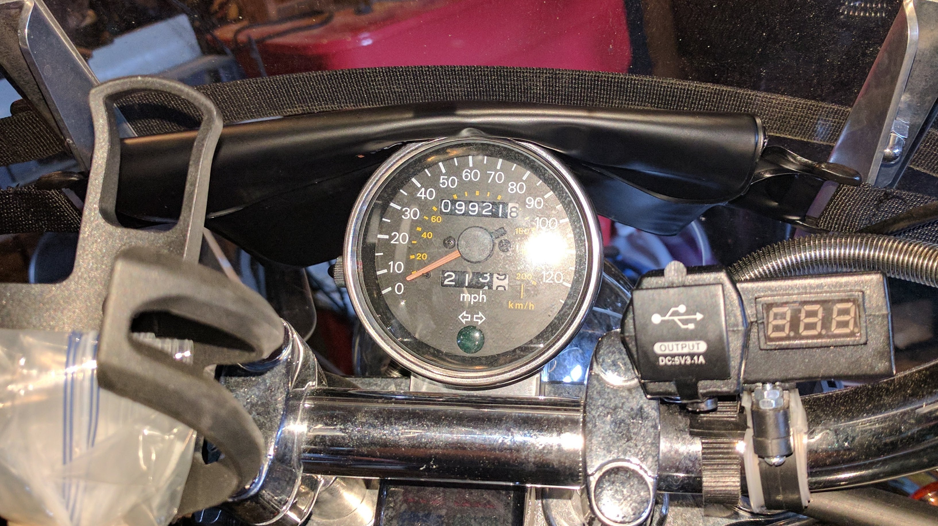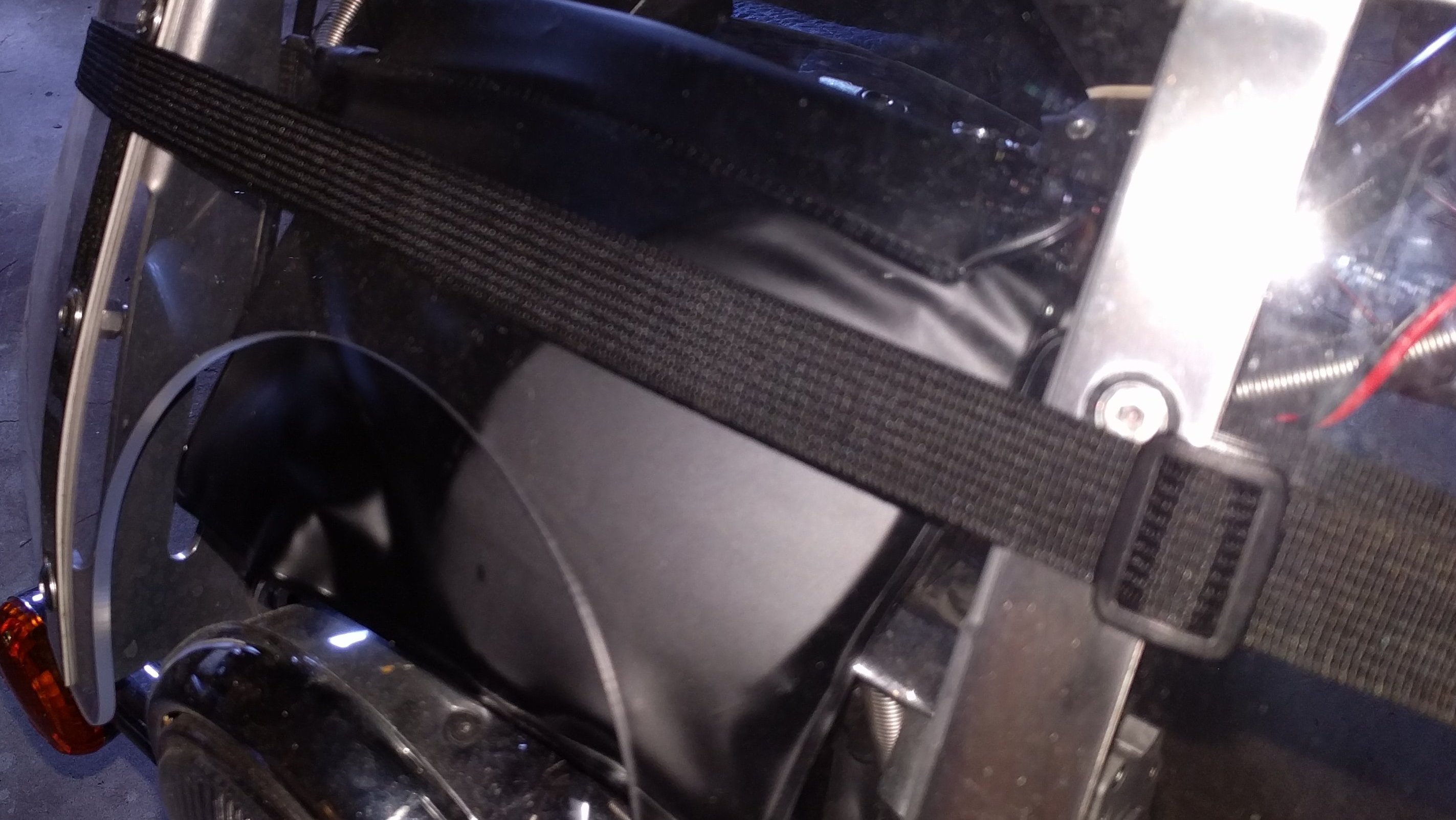 And here is what it looks like from the front of the bike ..... the pouch folds over the top of the speedo and the top of it is kept somewhat away from any rain flow past the headlight.