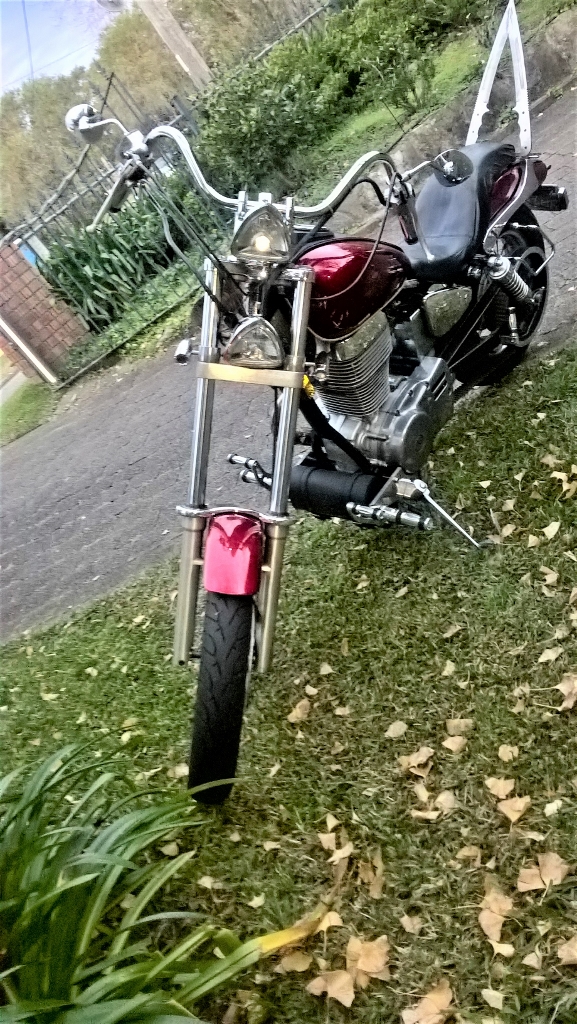 1999 Savage, basically stock, except drag bars, 4"risers,Jardine turn out muffler, Raptor petcock, Verslagen modified cam chain adjuster,4" forward controls