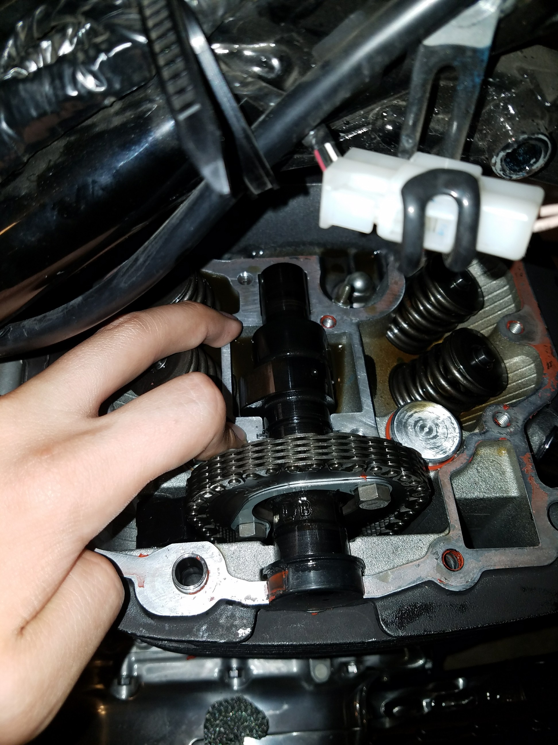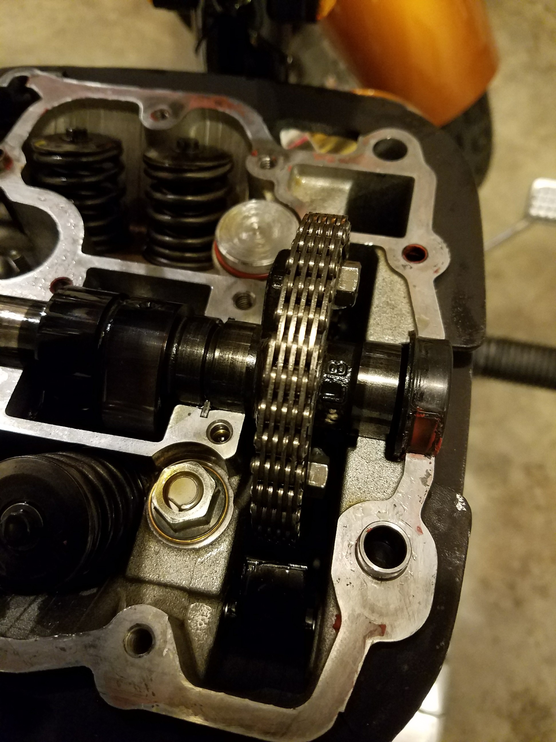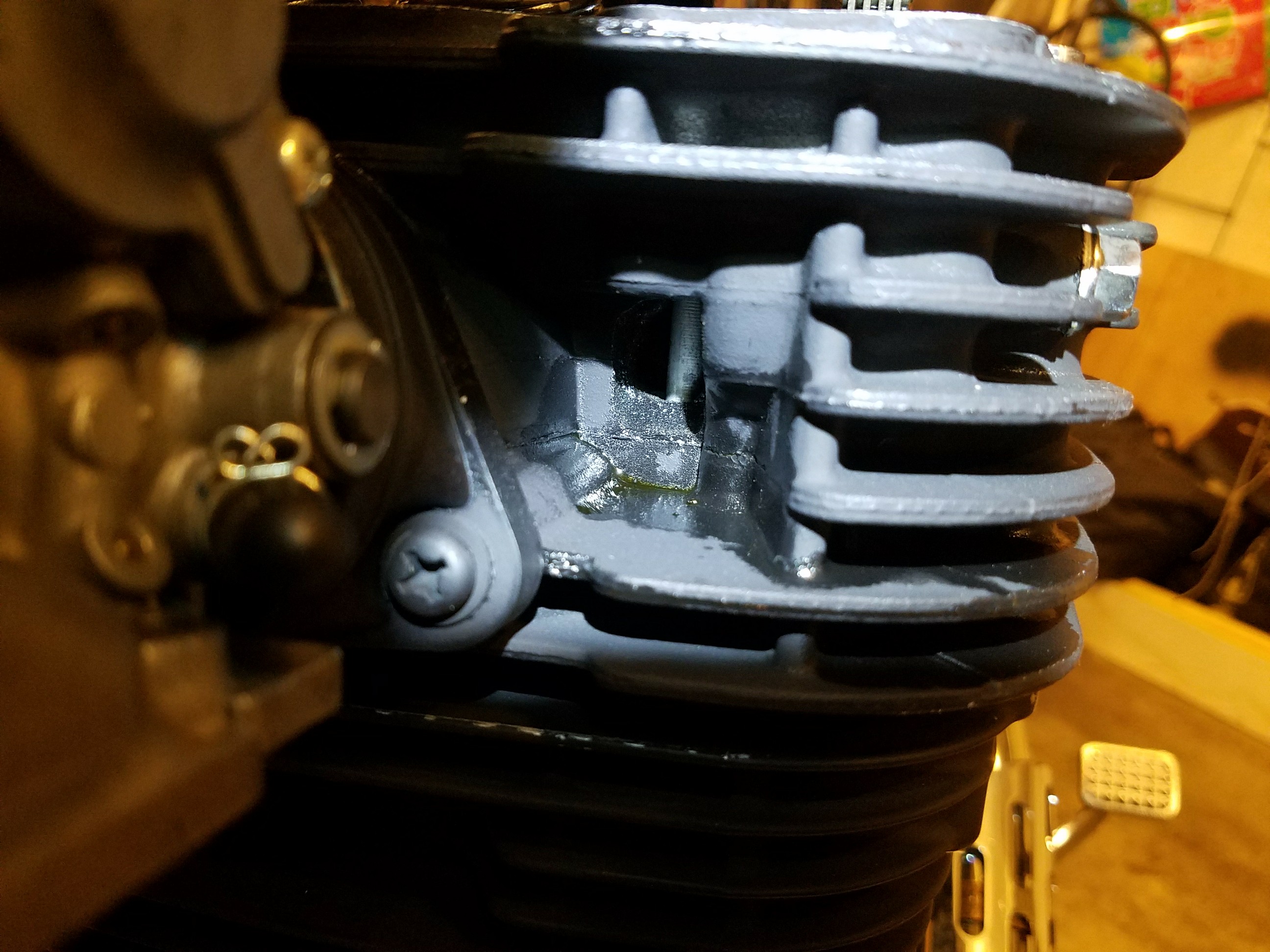 After a long ride, where I pushed it A bit more than I had, I noticed an oil leak from the air passage at the back right of the head (see photo) . It looked like maybe a leak out the head bots, so I went back and took off the valve cover.