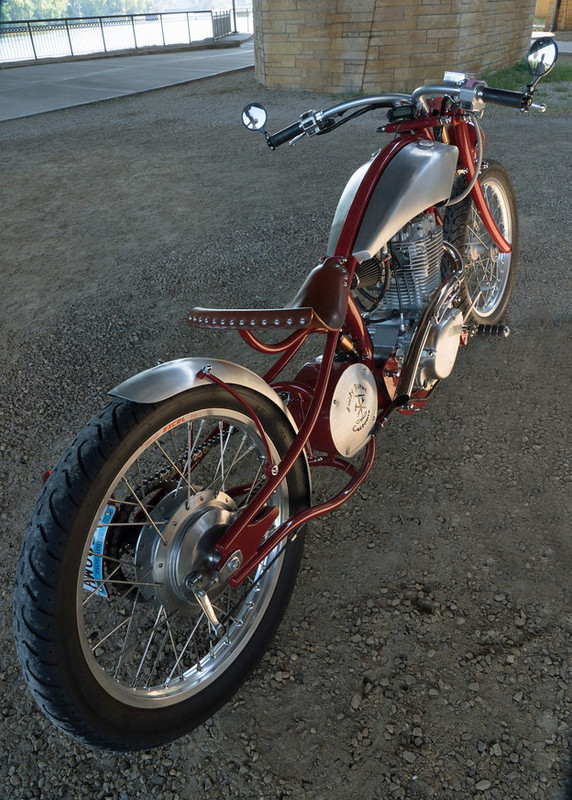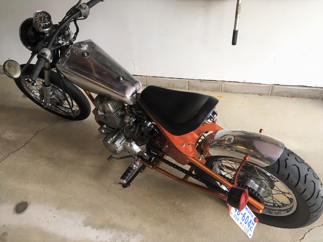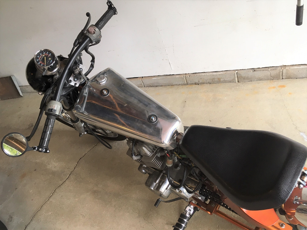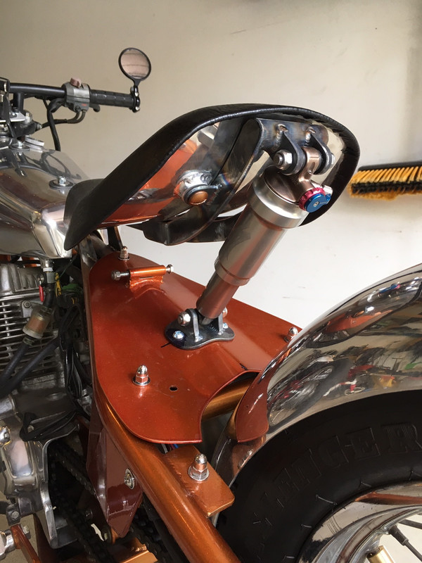That bike in the background is my first build, a little Honda Nighthawk 250. I built it a few years ago. Similar to the Savage I saved the neck from the stock frame and built the rest. This one has been through many revisions. 3 tanks, 2 front fenders, 2 rear fenders, at least 5 seats. I liked the mountain bike shock on the Savage seat enough to want the same thing on the Honda. That's what drove the latest tank and seat revision. The shock on the Honda provides about 3 inches of travel and improves the ride over 3 inch coil springs substantially.